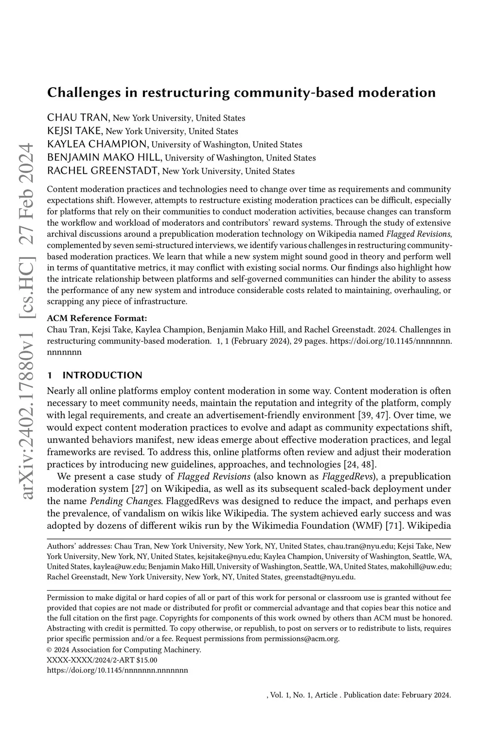 Content moderation practices and technologies need to change over time as requirements and community expectations shift. However, attempts to restructure existing moderation practices can be difficult, especially for platforms that rely on their communities to conduct moderation activities, because changes can transform the workflow and workload of moderators and contributors' reward systems. Through the study of extensive archival discussions around a prepublication moderation technology on Wikipedia named Flagged Revisions, complemented by seven semi-structured interviews, we identify various challenges in restructuring community-based moderation practices. We learn that while a new system might sound good in theory and perform well in terms of quantitative metrics, it may conflict with existing social norms. Our findings also highlight how the intricate relationship between platforms and self-governed communities can hinder the ability to assess the performance of any new system and introduce considerable costs related to maintaining, overhauling, or scrapping any piece of infrastructure.
