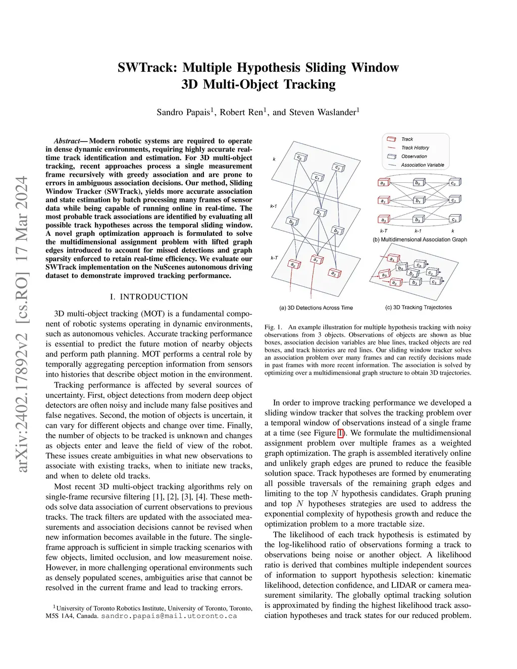 Modern robotic systems are required to operate in dense dynamic environments, requiring highly accurate real-time track identification and estimation. For 3D multi-object tracking, recent approaches process a single measurement frame recursively with greedy association and are prone to errors in ambiguous association decisions. Our method, Sliding Window Tracker (SWTrack), yields more accurate association and state estimation by batch processing many frames of sensor data while being capable of running online in real-time. The most probable track associations are identified by evaluating all possible track hypotheses across the temporal sliding window. A novel graph optimization approach is formulated to solve the multidimensional assignment problem with lifted graph edges introduced to account for missed detections and graph sparsity enforced to retain real-time efficiency. We evaluate our SWTrack implementation on the NuScenes autonomous driving dataset to demonstrate improved tracking performance.