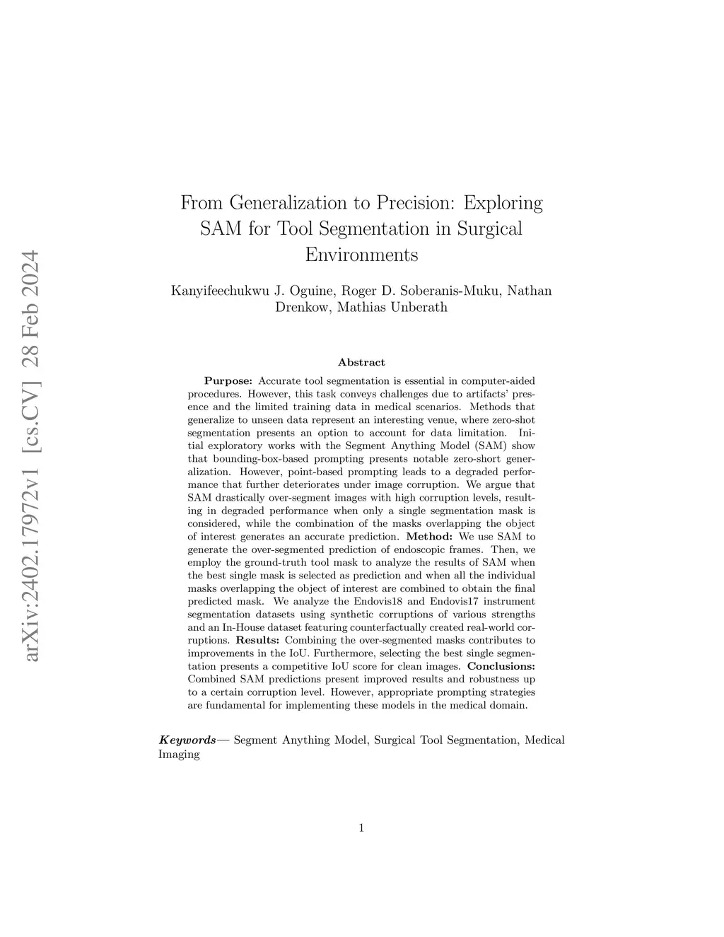Purpose: Accurate tool segmentation is essential in computer-aided procedures. However, this task conveys challenges due to artifacts' presence and the limited training data in medical scenarios. Methods that generalize to unseen data represent an interesting venue, where zero-shot segmentation presents an option to account for data limitation. Initial exploratory works with the Segment Anything Model (SAM) show that bounding-box-based prompting presents notable zero-short generalization. However, point-based prompting leads to a degraded performance that further deteriorates under image corruption. We argue that SAM drastically over-segment images with high corruption levels, resulting in degraded performance when only a single segmentation mask is considered, while the combination of the masks overlapping the object of interest generates an accurate prediction. Method: We use SAM to generate the over-segmented prediction of endoscopic frames. Then, we employ the ground-truth tool mask to analyze the results of SAM when the best single mask is selected as prediction and when all the individual masks overlapping the object of interest are combined to obtain the final predicted mask. We analyze the Endovis18 and Endovis17 instrument segmentation datasets using synthetic corruptions of various strengths and an In-House dataset featuring counterfactually created real-world corruptions. Results: Combining the over-segmented masks contributes to improvements in the IoU. Furthermore, selecting the best single segmentation presents a competitive IoU score for clean images. Conclusions: Combined SAM predictions present improved results and robustness up to a certain corruption level. However, appropriate prompting strategies are fundamental for implementing these models in the medical domain.