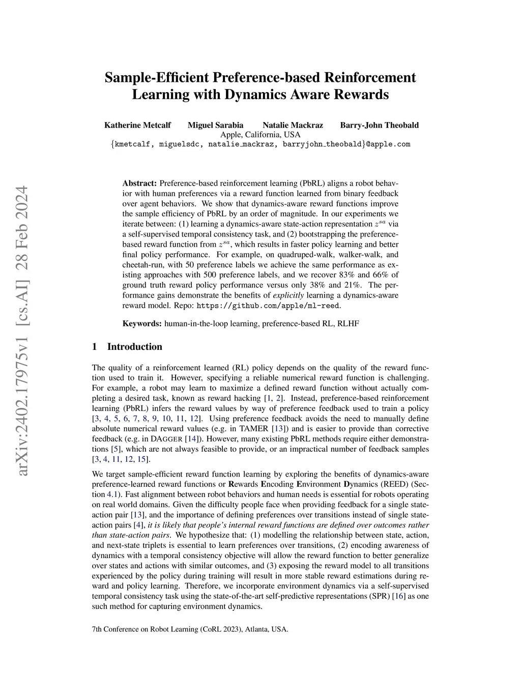 Preference-based reinforcement learning (PbRL) aligns a robot behavior with human preferences via a reward function learned from binary feedback over agent behaviors. We show that dynamics-aware reward functions improve the sample efficiency of PbRL by an order of magnitude. In our experiments we iterate between: (1) learning a dynamics-aware state-action representation (z^{sa}) via a self-supervised temporal consistency task, and (2) bootstrapping the preference-based reward function from (z^{sa}), which results in faster policy learning and better final policy performance. For example, on quadruped-walk, walker-walk, and cheetah-run, with 50 preference labels we achieve the same performance as existing approaches with 500 preference labels, and we recover 83\% and 66\% of ground truth reward policy performance versus only 38\% and 21\%. The performance gains demonstrate the benefits of explicitly learning a dynamics-aware reward model. Repo: \texttt{https://github.com/apple/ml-reed}.