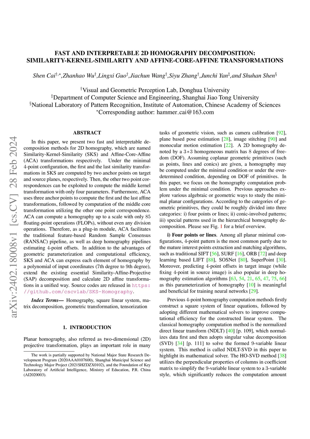 In this paper, we present two fast and interpretable decomposition methods for 2D homography, which are named Similarity-Kernel-Similarity (SKS) and Affine-Core-Affine (ACA) transformations respectively. Under the minimal -point configuration, the first and the last similarity transformations in SKS are computed by two anchor points on target and source planes, respectively. Then, the other two point correspondences can be exploited to compute the middle kernel transformation with only four parameters. Furthermore, ACA uses three anchor points to compute the first and the last affine transformations, followed by computation of the middle core transformation utilizing the other one point correspondence. ACA can compute a homography up to a scale with only floating-point operations (FLOPs), without even any division operations. Therefore, as a plug-in module, ACA facilitates the traditional feature-based Random Sample Consensus (RANSAC) pipeline, as well as deep homography pipelines estimating -point offsets. In addition to the advantages of geometric parameterization and computational efficiency, SKS and ACA can express each element of homography by a polynomial of input coordinates (th degree to th degree), extend the existing essential Similarity-Affine-Projective (SAP) decomposition and calculate 2D affine transformations in a unified way. Source codes are released in https://github.com/cscvlab/SKS-Homography.