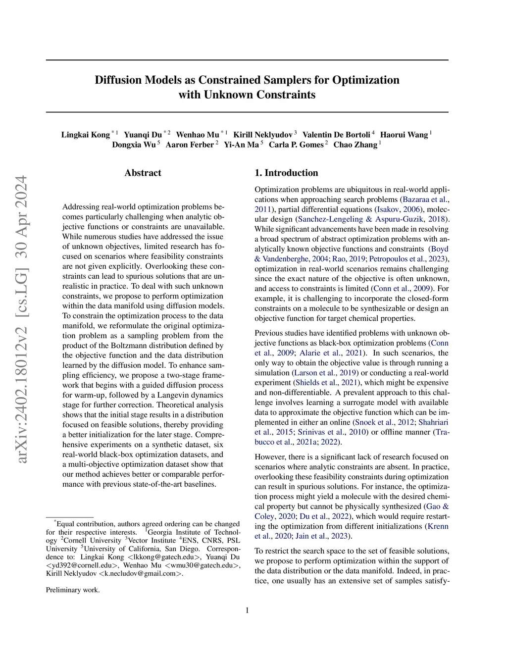 Addressing real-world optimization problems becomes particularly challenging when analytic objective functions or constraints are unavailable. While numerous studies have addressed the issue of unknown objectives, limited research has focused on scenarios where feasibility constraints are not given explicitly. Overlooking these constraints can lead to spurious solutions that are unrealistic in practice. To deal with such unknown constraints, we propose to perform optimization within the data manifold using diffusion models. To constrain the optimization process to the data manifold, we reformulate the original optimization problem as a sampling problem from the product of the Boltzmann distribution defined by the objective function and the data distribution learned by the diffusion model. Depending on the differentiability of the objective function, we propose two different sampling methods. For differentiable objectives, we propose a two-stage framework that begins with a guided diffusion process for warm-up, followed by a Langevin dynamics stage for further correction. For non-differentiable objectives, we propose an iterative importance sampling strategy using the diffusion model as the proposal distribution. Comprehensive experiments on a synthetic dataset, six real-world black-box optimization datasets, and a multi-objective molecule optimization dataset show that our method achieves better or comparable performance with previous state-of-the-art baselines.