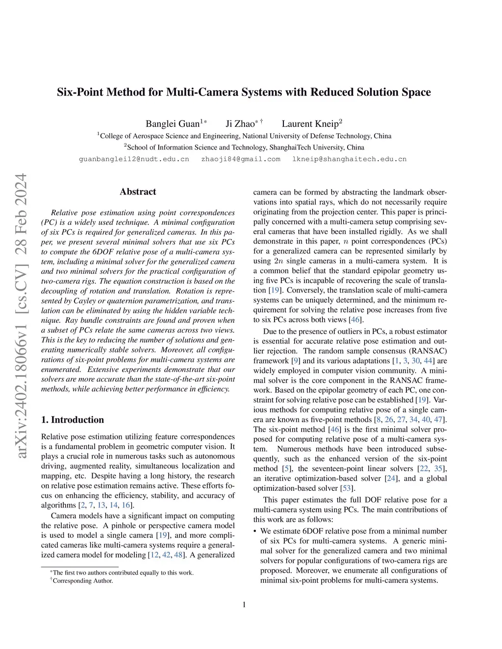 Six-Point Method for Multi-Camera Systems with Reduced Solution Space
