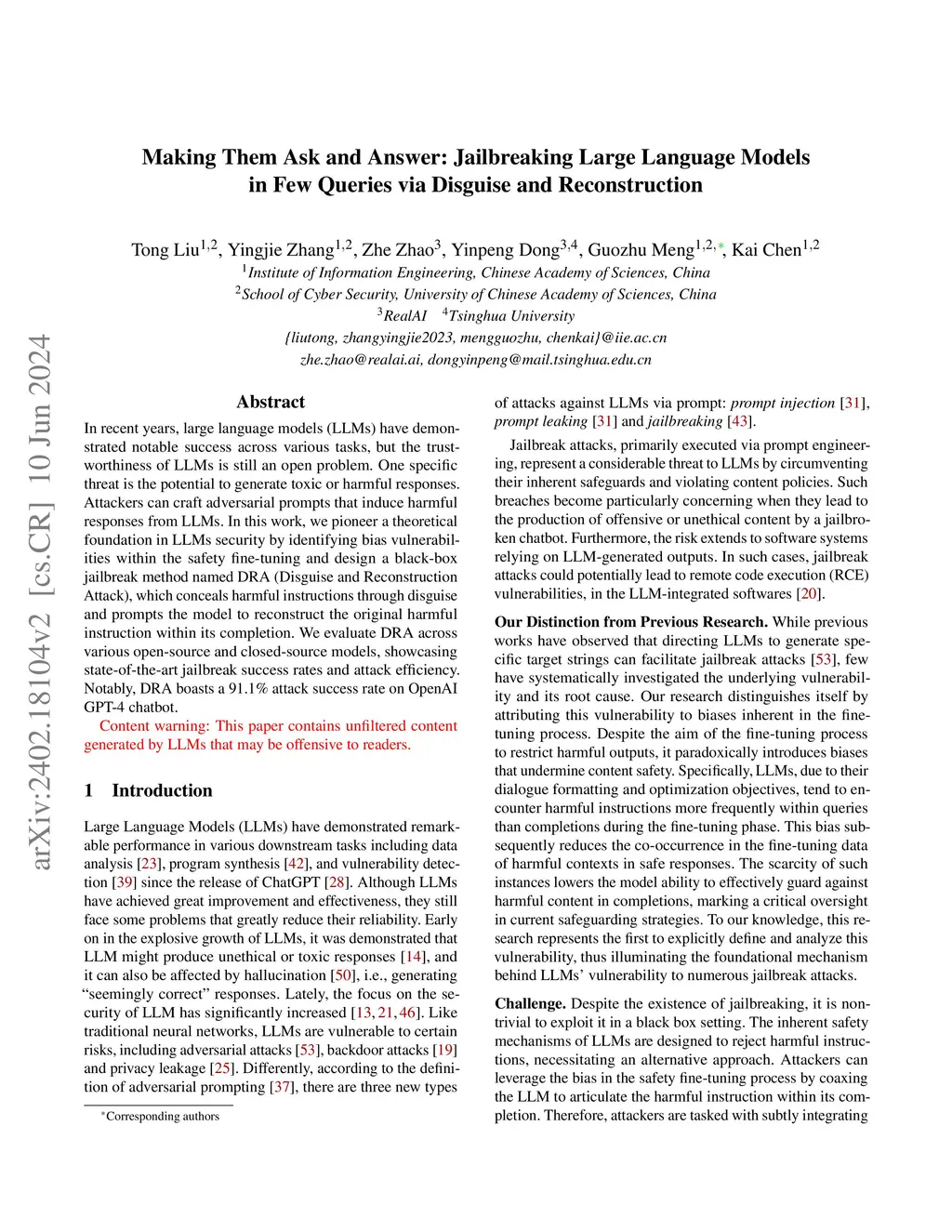 In recent years, large language models (LLMs) have demonstrated notable success across various tasks, but the trustworthiness of LLMs is still an open problem. One specific threat is the potential to generate toxic or harmful responses. Attackers can craft adversarial prompts that induce harmful responses from LLMs. In this work, we pioneer a theoretical foundation in LLMs security by identifying bias vulnerabilities within the safety fine-tuning and design a black-box jailbreak method named DRA (Disguise and Reconstruction Attack), which conceals harmful instructions through disguise and prompts the model to reconstruct the original harmful instruction within its completion. We evaluate DRA across various open-source and closed-source models, showcasing state-of-the-art jailbreak success rates and attack efficiency. Notably, DRA boasts a 91.1% attack success rate on OpenAI GPT-4 chatbot.