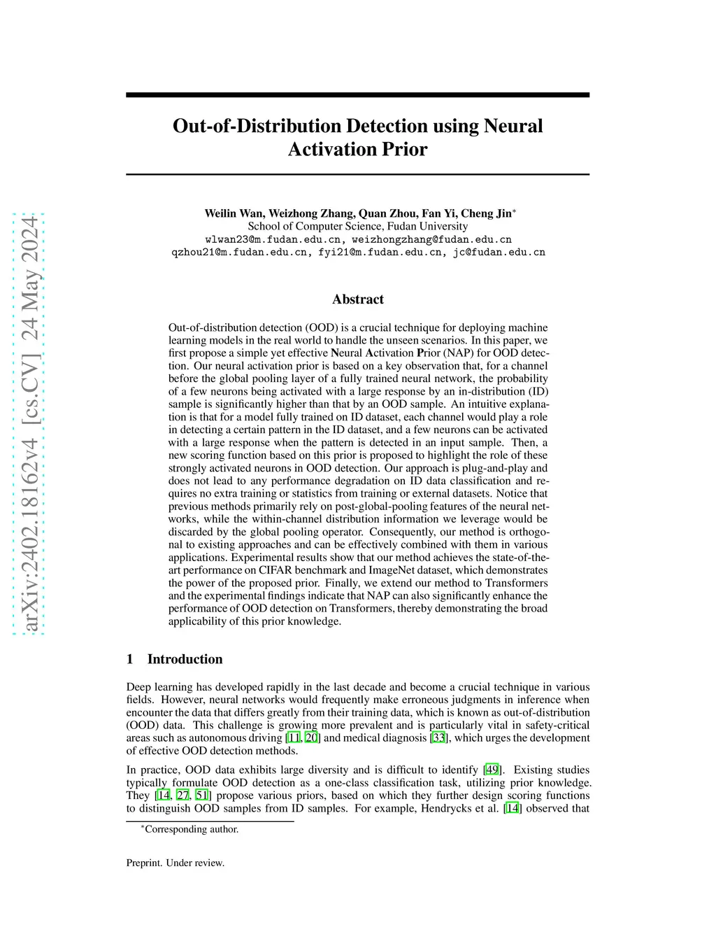 Out-of-distribution detection (OOD) is a crucial technique for deploying machine learning models in the real world to handle the unseen scenarios. In this paper, we first propose a simple yet effective Neural Activation Prior (NAP) for OOD detection. Our neural activation prior is based on a key observation that, for a channel before the global pooling layer of a fully trained neural network, the probability of a few neurons being activated with a large response by an in-distribution (ID) sample is significantly higher than that by an OOD sample. An intuitive explanation is that for a model fully trained on ID dataset, each channel would play a role in detecting a certain pattern in the ID dataset, and a few neurons can be activated with a large response when the pattern is detected in an input sample. Then, a new scoring function based on this prior is proposed to highlight the role of these strongly activated neurons in OOD detection. Our approach is plug-and-play and does not lead to any performance degradation on ID data classification and requires no extra training or statistics from training or external datasets. Notice that previous methods primarily rely on post-global-pooling features of the neural networks, while the within-channel distribution information we leverage would be discarded by the global pooling operator. Consequently, our method is orthogonal to existing approaches and can be effectively combined with them in various applications. Experimental results show that our method achieves the state-of-the-art performance on CIFAR benchmark and ImageNet dataset, which demonstrates the power of the proposed prior. Finally, we extend our method to Transformers and the experimental findings indicate that NAP can also significantly enhance the performance of OOD detection on Transformers, thereby demonstrating the broad applicability of this prior knowledge.