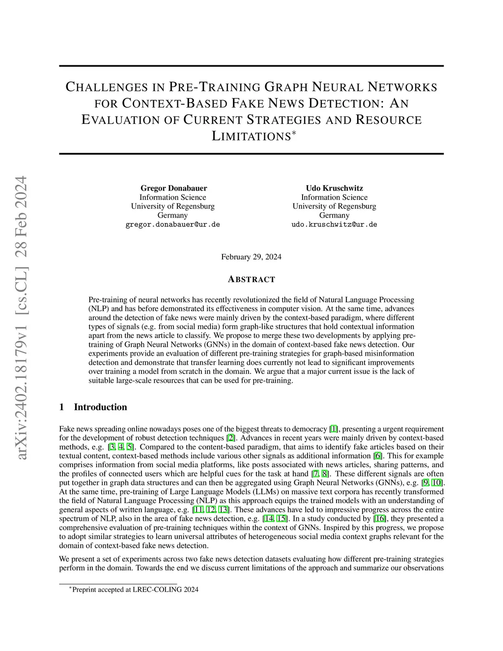 Challenges in Pre-Training Graph Neural Networks for Context-Based Fake