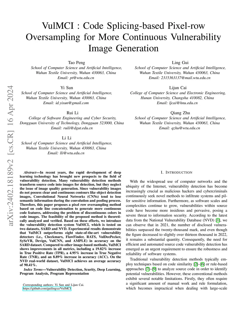 In recent years, the rapid development of deep learning technology has brought new prospects to the field of vulnerability detection. Many vulnerability detection methods involve converting source code into images for detection, yet they often overlook the quality of the generated images. Due to the fact that vulnerability images lack clear and continuous contours, unlike images used in object detection, Convolutional Neural Networks (CNNs) tend to lose semantic information during the convolution and pooling processes. Therefore, this paper proposes a pixel row oversampling method based on code line concatenation to generate more continuous code features, addressing the issue of discontinuity in code image coloration.Building upon these contributions, we propose the vulnerability detection system VulMCI and conduct tests on the SARD and NVD datasets. Experimental results demonstrate that VulMCI outperforms seven state-of-the-art vulnerability detectors (namely Checkmarx, FlawFinder, RATS, VulDeePecker, SySeVR, VulCNN, and Devign). Compared to other image-based methods, VulMCI shows improvements in various metrics, including a 2.877\% increase in True Positive Rate (TPR), a 5.446\% increase in True Negative Rate (TNR), and a 5.91\% increase in Accuracy (ACC). On the NVD real-world dataset, VulMCI achieves an average accuracy of 5.162\%, confirming its value in practical vulnerability detection applications.