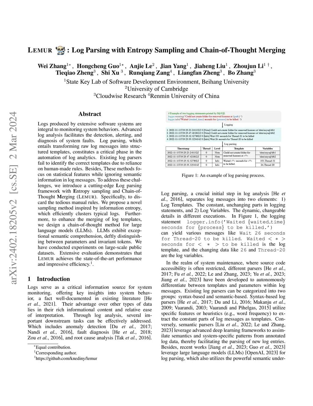 Lemur: Log Parsing with Entropy Sampling and Chain-of-Thought Merging