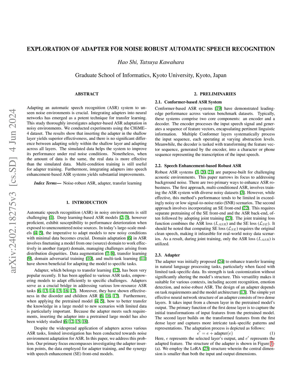 Exploration of Adapter for Noise Robust Automatic Speech Recognition