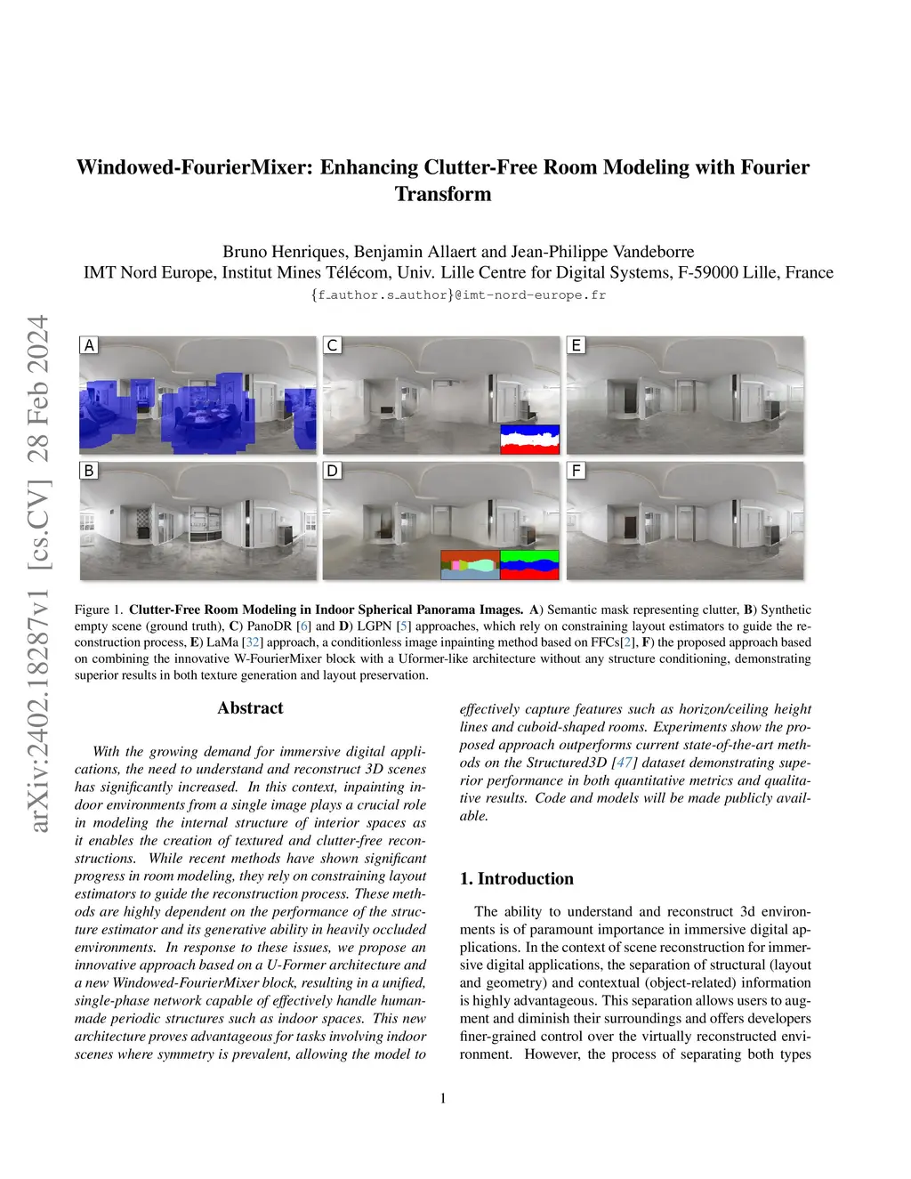 With the growing demand for immersive digital applications, the need to understand and reconstruct 3D scenes has significantly increased. In this context, inpainting indoor environments from a single image plays a crucial role in modeling the internal structure of interior spaces as it enables the creation of textured and clutter-free reconstructions. While recent methods have shown significant progress in room modeling, they rely on constraining layout estimators to guide the reconstruction process. These methods are highly dependent on the performance of the structure estimator and its generative ability in heavily occluded environments. In response to these issues, we propose an innovative approach based on a U-Former architecture and a new Windowed-FourierMixer block, resulting in a unified, single-phase network capable of effectively handle human-made periodic structures such as indoor spaces. This new architecture proves advantageous for tasks involving indoor scenes where symmetry is prevalent, allowing the model to effectively capture features such as horizon/ceiling height lines and cuboid-shaped rooms. Experiments show the proposed approach outperforms current state-of-the-art methods on the Structured3D dataset demonstrating superior performance in both quantitative metrics and qualitative results. Code and models will be made publicly available.