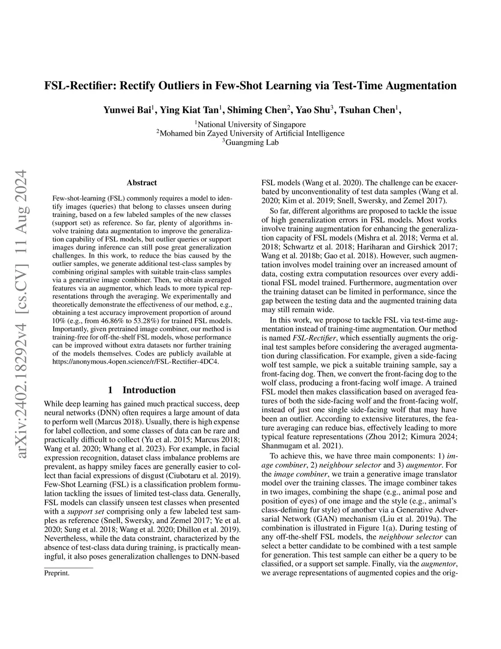 Few-shot-learning (FSL) commonly requires a model to identify images (queries) that belong to classes unseen during training, based on a few labelled samples of the new classes (support set) as reference. As the test classes are novel, FSL is challenging with high generalization error with respect to the novel classes, where outliers query or support image during inference exacerbate the error further. So far, plenty of algorithms involve training data augmentation to improve the generalization capability of FSL models. In contrast, inspired by the fact that test samples are more relevant to the target domain, we believe that test-time augmentation may be more useful than training augmentation for FSL. In this work, to reduce the bias caused by unconventional test samples, we generate new test samples through combining them with similar train-class samples. Averaged representations of the test-time augmentation are then considered for few-shot classification. According to our experiments, by augmenting the support set and query with a few additional generated sample, we can achieve improvement for trained FSL models. Importantly, our method is universally compatible with different off-the-shelf FSL models, whose performance can be improved without extra dataset nor further training of the models themselves. Codes are available at https://github.com/WendyBaiYunwei/FSL-Rectifier.