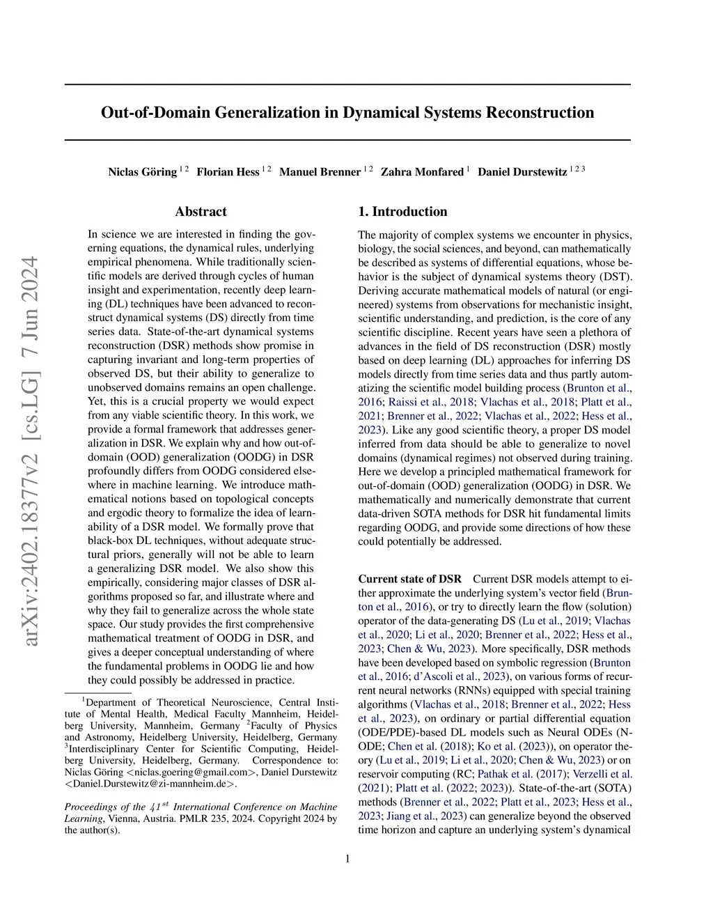 In science we are interested in finding the governing equations, the dynamical rules, underlying empirical phenomena. While traditionally scientific models are derived through cycles of human insight and experimentation, recently deep learning (DL) techniques have been advanced to reconstruct dynamical systems (DS) directly from time series data. State-of-the-art dynamical systems reconstruction (DSR) methods show promise in capturing invariant and long-term properties of observed DS, but their ability to generalize to unobserved domains remains an open challenge. Yet, this is a crucial property we would expect from any viable scientific theory. In this work, we provide a formal framework that addresses generalization in DSR. We explain why and how out-of-domain (OOD) generalization (OODG) in DSR profoundly differs from OODG considered elsewhere in machine learning. We introduce mathematical notions based on topological concepts and ergodic theory to formalize the idea of learnability of a DSR model. We formally prove that black-box DL techniques, without adequate structural priors, generally will not be able to learn a generalizing DSR model. We also show this empirically, considering major classes of DSR algorithms proposed so far, and illustrate where and why they fail to generalize across the whole phase space. Our study provides the first comprehensive mathematical treatment of OODG in DSR, and gives a deeper conceptual understanding of where the fundamental problems in OODG lie and how they could possibly be addressed in practice.