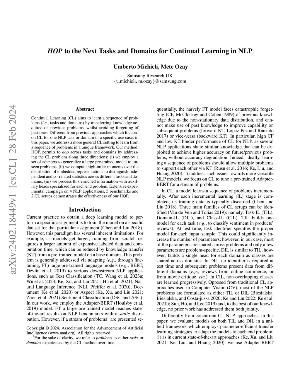 HOP to the Next Tasks and Domains for Continual Learning in NLP