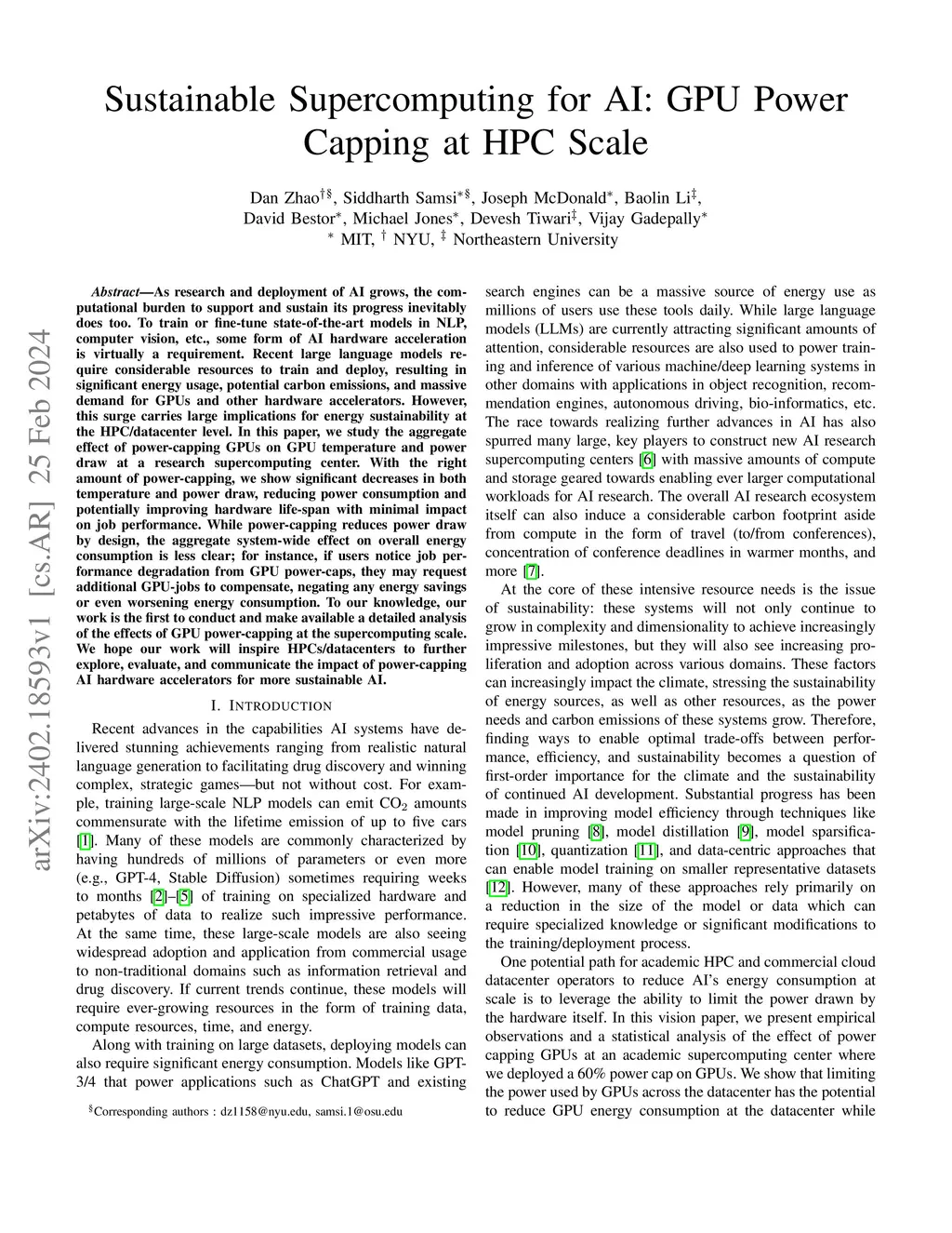 As research and deployment of AI grows, the computational burden to support and sustain its progress inevitably does too. To train or fine-tune state-of-the-art models in NLP, computer vision, etc., some form of AI hardware acceleration is virtually a requirement. Recent large language models require considerable resources to train and deploy, resulting in significant energy usage, potential carbon emissions, and massive demand for GPUs and other hardware accelerators. However, this surge carries large implications for energy sustainability at the HPC/datacenter level. In this paper, we study the aggregate effect of power-capping GPUs on GPU temperature and power draw at a research supercomputing center. With the right amount of power-capping, we show significant decreases in both temperature and power draw, reducing power consumption and potentially improving hardware life-span with minimal impact on job performance. While power-capping reduces power draw by design, the aggregate system-wide effect on overall energy consumption is less clear; for instance, if users notice job performance degradation from GPU power-caps, they may request additional GPU-jobs to compensate, negating any energy savings or even worsening energy consumption. To our knowledge, our work is the first to conduct and make available a detailed analysis of the effects of GPU power-capping at the supercomputing scale. We hope our work will inspire HPCs/datacenters to further explore, evaluate, and communicate the impact of power-capping AI hardware accelerators for more sustainable AI.