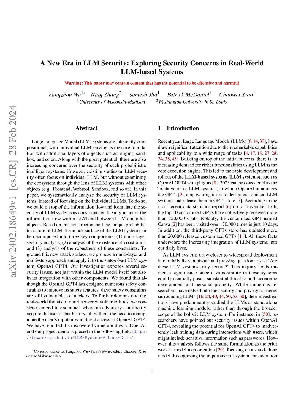 Large Language Model (LLM) systems are inherently compositional, with individual LLM serving as the core foundation with additional layers of objects such as plugins, sandbox, and so on. Along with the great potential, there are also increasing concerns over the security of such probabilistic intelligent systems. However, existing studies on LLM security often focus on individual LLM, but without examining the ecosystem through the lens of LLM systems with other objects (e.g., Frontend, Webtool, Sandbox, and so on). In this paper, we systematically analyze the security of LLM systems, instead of focusing on the individual LLMs. To do so, we build on top of the information flow and formulate the security of LLM systems as constraints on the alignment of the information flow within LLM and between LLM and other objects. Based on this construction and the unique probabilistic nature of LLM, the attack surface of the LLM system can be decomposed into three key components: (1) multi-layer security analysis, (2) analysis of the existence of constraints, and (3) analysis of the robustness of these constraints. To ground this new attack surface, we propose a multi-layer and multi-step approach and apply it to the state-of-art LLM system, OpenAI GPT4. Our investigation exposes several security issues, not just within the LLM model itself but also in its integration with other components. We found that although the OpenAI GPT4 has designed numerous safety constraints to improve its safety features, these safety constraints are still vulnerable to attackers. To further demonstrate the real-world threats of our discovered vulnerabilities, we construct an end-to-end attack where an adversary can illicitly acquire the user's chat history, all without the need to manipulate the user's input or gain direct access to OpenAI GPT4. Our demo is in the link: https://fzwark.github.io/LLM-System-Attack-Demo/