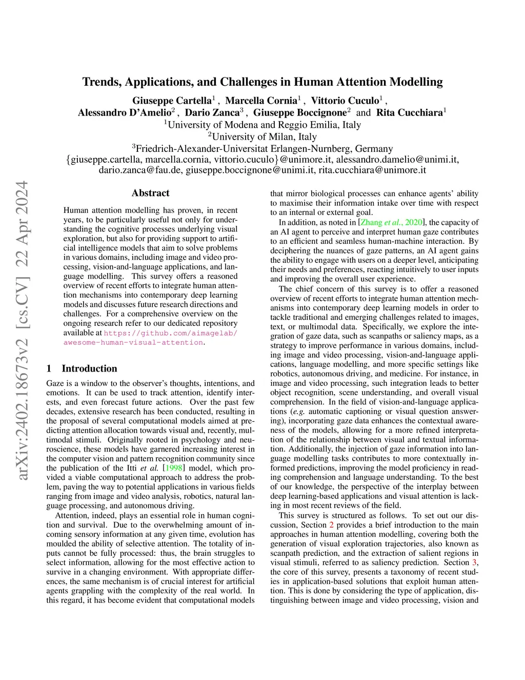 Human attention modelling has proven, in recent years, to be particularly useful not only for understanding the cognitive processes underlying visual exploration, but also for providing support to artificial intelligence models that aim to solve problems in various domains, including image and video processing, vision-and-language applications, and language modelling. This survey offers a reasoned overview of recent efforts to integrate human attention mechanisms into contemporary deep learning models and discusses future research directions and challenges. For a comprehensive overview on the ongoing research refer to our dedicated repository available at https://github.com/aimagelab/awesome-human-visual-attention.