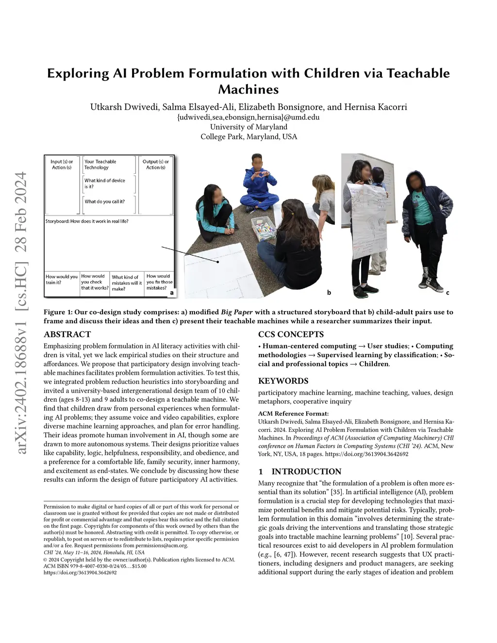 Emphasizing problem formulation in AI literacy activities with children is vital, yet we lack empirical studies on their structure and affordances. We propose that participatory design involving teachable machines facilitates problem formulation activities. To test this, we integrated problem reduction heuristics into storyboarding and invited a university-based intergenerational design team of 10 children (ages 8-13) and 9 adults to co-design a teachable machine. We find that children draw from personal experiences when formulating AI problems; they assume voice and video capabilities, explore diverse machine learning approaches, and plan for error handling. Their ideas promote human involvement in AI, though some are drawn to more autonomous systems. Their designs prioritize values like capability, logic, helpfulness, responsibility, and obedience, and a preference for a comfortable life, family security, inner harmony, and excitement as end-states. We conclude by discussing how these results can inform the design of future participatory AI activities.