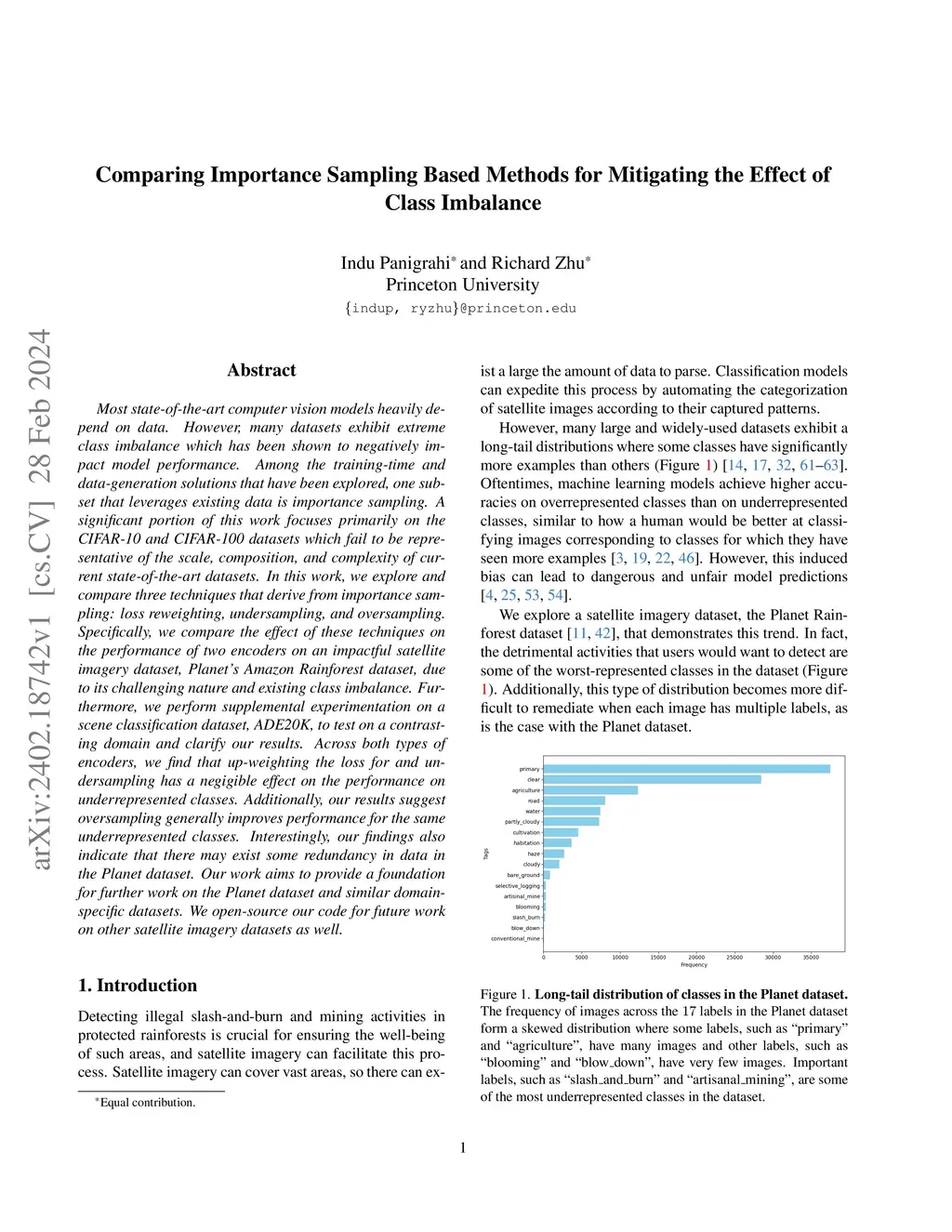 Most state-of-the-art computer vision models heavily depend on data. However, many datasets exhibit extreme class imbalance which has been shown to negatively impact model performance. Among the training-time and data-generation solutions that have been explored, one subset that leverages existing data is importance sampling. A good deal of this work focuses primarily on the CIFAR-10 and CIFAR-100 datasets which fail to be representative of the scale, composition, and complexity of current state-of-the-art datasets. In this work, we explore and compare three techniques that derive from importance sampling: loss reweighting, undersampling, and oversampling. Specifically, we compare the effect of these techniques on the performance of two encoders on an impactful satellite imagery dataset, Planet's Amazon Rainforest dataset, in preparation for another work. Furthermore, we perform supplemental experimentation on a scene classification dataset, ADE20K, to test on a contrasting domain and clarify our results. Across both types of encoders, we find that up-weighting the loss for and undersampling has a negigible effect on the performance on underrepresented classes. Additionally, our results suggest oversampling generally improves performance for the same underrepresented classes. Interestingly, our findings also indicate that there may exist some redundancy in data in the Planet dataset. Our work aims to provide a foundation for further work on the Planet dataset and similar domain-specific datasets. We open-source our code at https://github.com/RichardZhu123/514-class-imbalance for future work on other satellite imagery datasets as well.