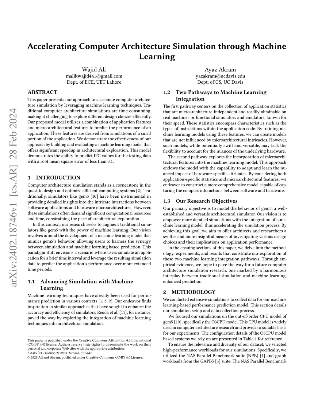 This paper presents our approach to accelerate computer architecture simulation by leveraging machine learning techniques. Traditional computer architecture simulations are time-consuming, making it challenging to explore different design choices efficiently. Our proposed model utilizes a combination of application features and micro-architectural features to predict the performance of an application. These features are derived from simulations of a small portion of the application. We demonstrate the effectiveness of our approach by building and evaluating a machine learning model that offers significant speedup in architectural exploration. This model demonstrates the ability to predict IPC values for the testing data with a root mean square error of less than 0.1.