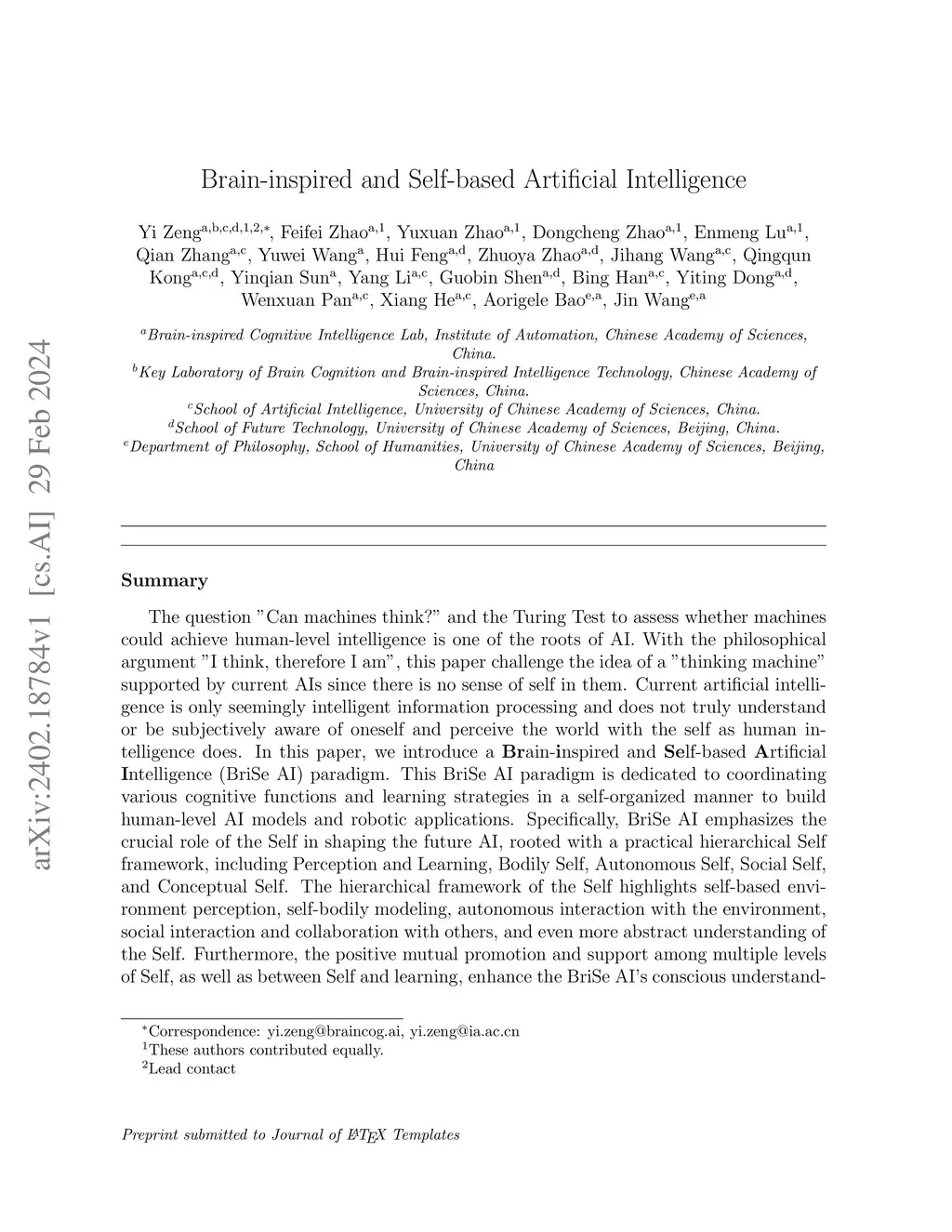 Brain-inspired and Self-based Artificial Intelligence