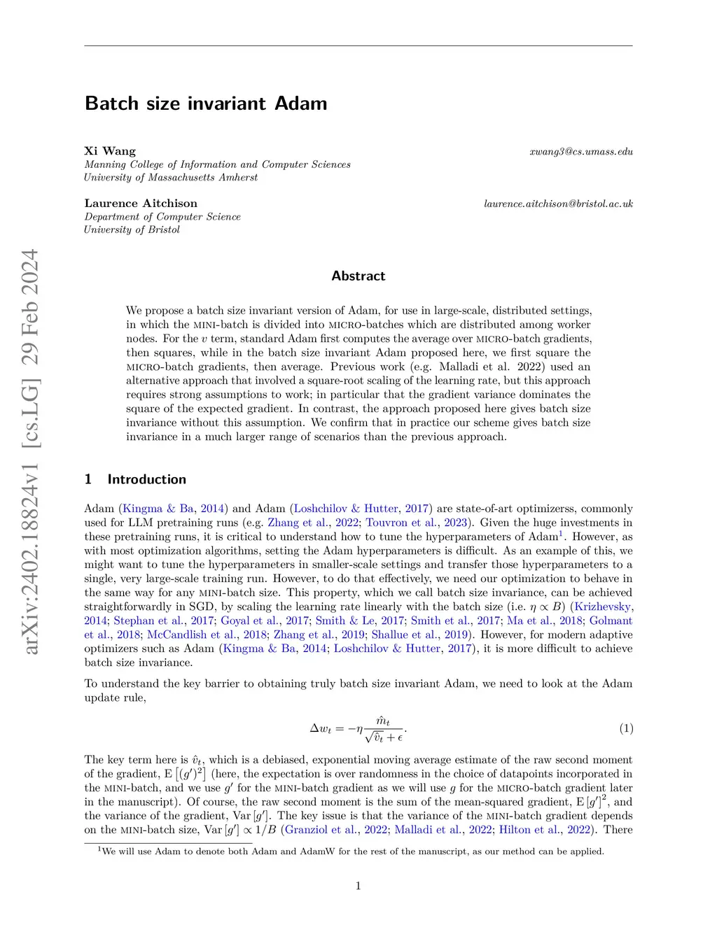 We propose a batch size invariant version of Adam, for use in large-scale, distributed settings, in which the mini-batch is divided into micro-batches which are distributed among worker nodes. For the v term, standard Adam first computes the average over micro-batch gradients, then squares, while in the batch size invariant Adam proposed here, we first square the micro-batch gradients, then average. Previous work (e.g. Malladi et al. 2022) used an alternative approach that involved a square-root scaling of the learning rate, but this approach requires strong assumptions to work; in particular that the gradient variance dominates the square of the expected gradient. In contrast, the approach proposed here gives batch size invariance without this assumption. We confirm that in practice our scheme gives batch size invariance in a much larger range of scenarios than the previous approach.