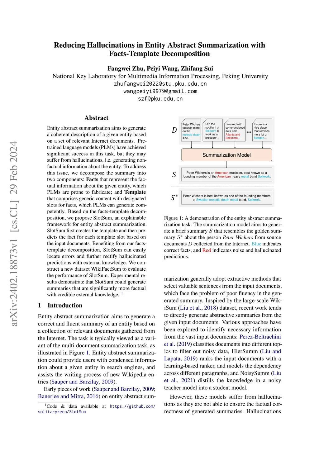 Entity abstract summarization aims to generate a coherent description of a given entity based on a set of relevant Internet documents. Pretrained language models (PLMs) have achieved significant success in this task, but they may suffer from hallucinations, i.e. generating non-factual information about the entity. To address this issue, we decompose the summary into two components: Facts that represent the factual information about the given entity, which PLMs are prone to fabricate; and Template that comprises generic content with designated slots for facts, which PLMs can generate competently. Based on the facts-template decomposition, we propose SlotSum, an explainable framework for entity abstract summarization. SlotSum first creates the template and then predicts the fact for each template slot based on the input documents. Benefiting from our facts-template decomposition, SlotSum can easily locate errors and further rectify hallucinated predictions with external knowledge. We construct a new dataset WikiFactSum to evaluate the performance of SlotSum. Experimental results demonstrate that SlotSum could generate summaries that are significantly more factual with credible external knowledge.