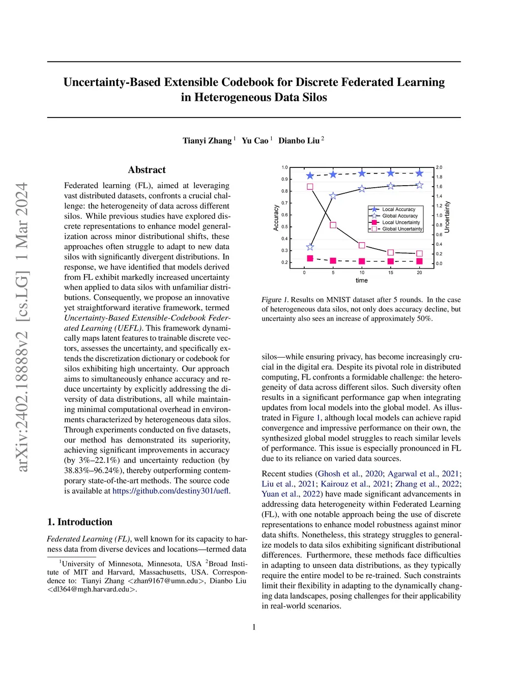 Federated learning (FL), aimed at leveraging vast distributed datasets, confronts a crucial challenge: the heterogeneity of data across different silos. While previous studies have explored discrete representations to enhance model generalization across minor distributional shifts, these approaches often struggle to adapt to new data silos with significantly divergent distributions. In response, we have identified that models derived from FL exhibit markedly increased uncertainty when applied to data silos with unfamiliar distributions. Consequently, we propose an innovative yet straightforward iterative framework, termed Uncertainty-Based Extensible-Codebook Federated Learning (UEFL). This framework dynamically maps latent features to trainable discrete vectors, assesses the uncertainty, and specifically extends the discretization dictionary or codebook for silos exhibiting high uncertainty. Our approach aims to simultaneously enhance accuracy and reduce uncertainty by explicitly addressing the diversity of data distributions, all while maintaining minimal computational overhead in environments characterized by heterogeneous data silos. Through experiments conducted on five datasets, our method has demonstrated its superiority, achieving significant improvements in accuracy (by 3%--22.1%) and uncertainty reduction (by 38.83%--96.24%), thereby outperforming contemporary state-of-the-art methods. The source code is available at this https URL.