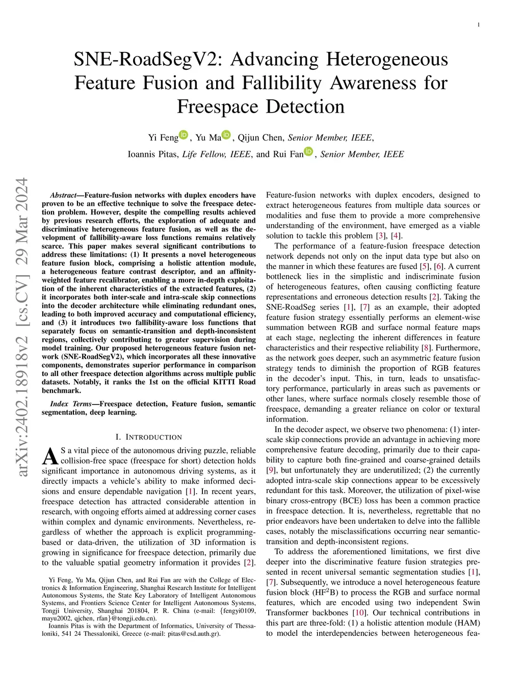 Feature-fusion networks with duplex encoders have proven to be an effective technique to solve the freespace detection problem. However, despite the compelling results achieved by previous research efforts, the exploration of adequate and discriminative heterogeneous feature fusion, as well as the development of fallibility-aware loss functions remains relatively scarce. This paper makes several significant contributions to address these limitations: (1) It presents a novel heterogeneous feature fusion block, comprising a holistic attention module, a heterogeneous feature contrast descriptor, and an affinity-weighted feature recalibrator, enabling a more in-depth exploitation of the inherent characteristics of the extracted features, (2) it incorporates both inter-scale and intra-scale skip connections into the decoder architecture while eliminating redundant ones, leading to both improved accuracy and computational efficiency, and (3) it introduces two fallibility-aware loss functions that separately focus on semantic-transition and depth-inconsistent regions, collectively contributing to greater supervision during model training. Our proposed heterogeneous feature fusion network (SNE-RoadSegV2), which incorporates all these innovative components, demonstrates superior performance in comparison to all other freespace detection algorithms across multiple public datasets. Notably, it ranks the 1st on the official KITTI Road benchmark.