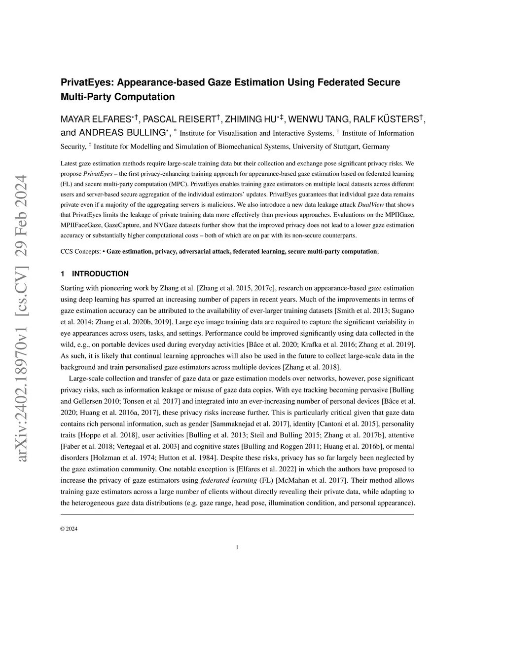 Latest gaze estimation methods require large-scale training data but their collection and exchange pose significant privacy risks. We propose PrivatEyes - the first privacy-enhancing training approach for appearance-based gaze estimation based on federated learning (FL) and secure multi-party computation (MPC). PrivatEyes enables training gaze estimators on multiple local datasets across different users and server-based secure aggregation of the individual estimators' updates. PrivatEyes guarantees that individual gaze data remains private even if a majority of the aggregating servers is malicious. We also introduce a new data leakage attack DualView that shows that PrivatEyes limits the leakage of private training data more effectively than previous approaches. Evaluations on the MPIIGaze, MPIIFaceGaze, GazeCapture, and NVGaze datasets further show that the improved privacy does not lead to a lower gaze estimation accuracy or substantially higher computational costs - both of which are on par with its non-secure counterparts.