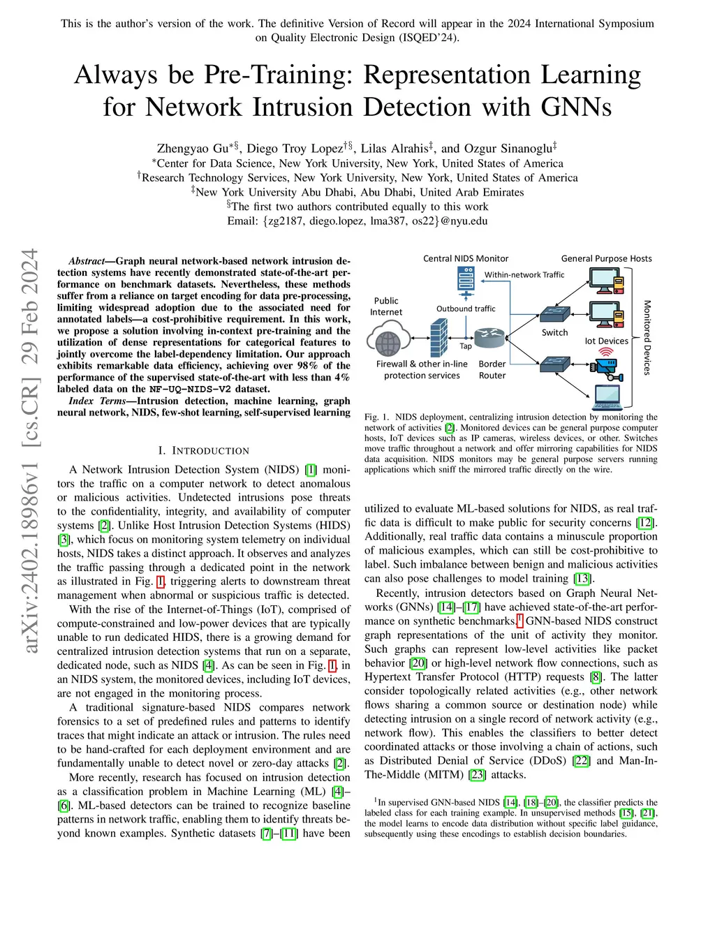 Graph neural network-based network intrusion detection systems have recently demonstrated state-of-the-art performance on benchmark datasets. Nevertheless, these methods suffer from a reliance on target encoding for data pre-processing, limiting widespread adoption due to the associated need for annotated labels--a cost-prohibitive requirement. In this work, we propose a solution involving in-context pre-training and the utilization of dense representations for categorical features to jointly overcome the label-dependency limitation. Our approach exhibits remarkable data efficiency, achieving over 98% of the performance of the supervised state-of-the-art with less than 4% labeled data on the NF-UQ-NIDS-V2 dataset.