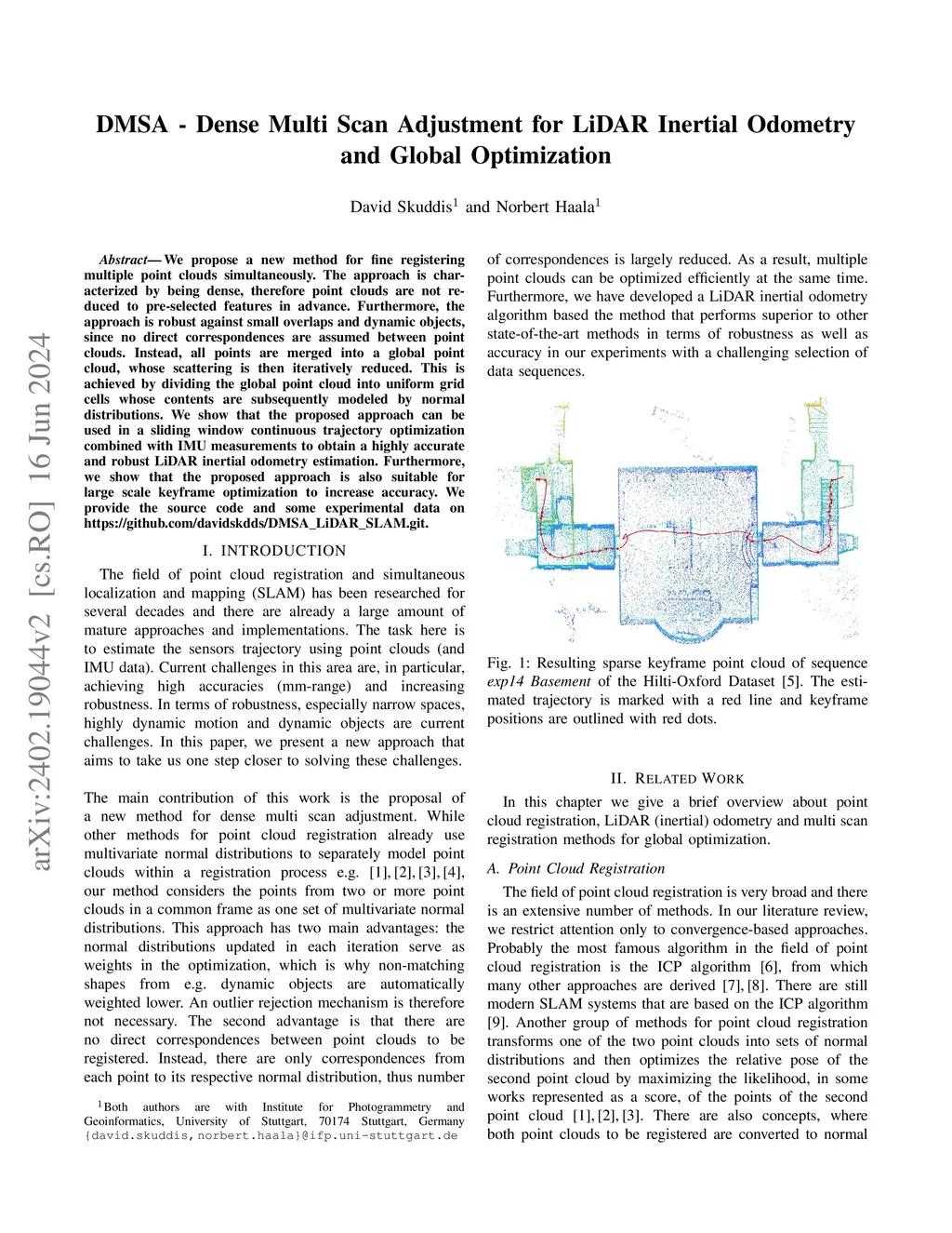 We propose a new method for fine registering multiple point clouds simultaneously. The approach is characterized by being dense, therefore point clouds are not reduced to pre-selected features in advance. Furthermore, the approach is robust against small overlaps and dynamic objects, since no direct correspondences are assumed between point clouds. Instead, all points are merged into a global point cloud, whose scattering is then iteratively reduced. This is achieved by dividing the global point cloud into uniform grid cells whose contents are subsequently modeled by normal distributions. We show that the proposed approach can be used in a sliding window continuous trajectory optimization combined with IMU measurements to obtain a highly accurate and robust LiDAR inertial odometry estimation. Furthermore, we show that the proposed approach is also suitable for large scale keyframe optimization to increase accuracy. We provide the source code and some experimental data on https://github.com/davidskdds/DMSA_LiDAR_SLAM.git.