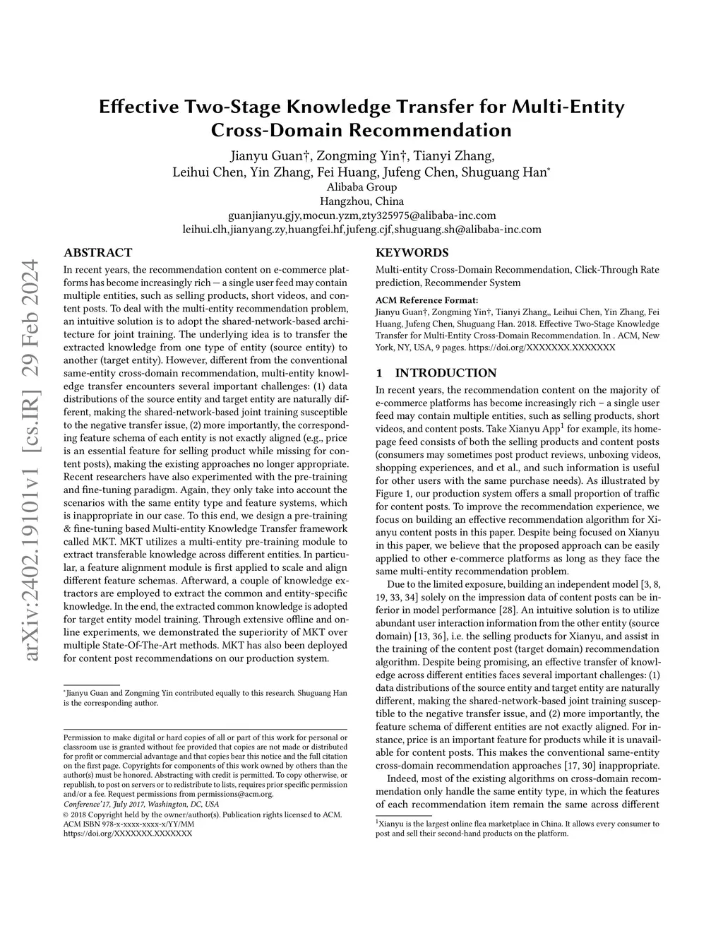 In recent years, the recommendation content on e-commerce platforms has become increasingly rich -- a single user feed may contain multiple entities, such as selling products, short videos, and content posts. To deal with the multi-entity recommendation problem, an intuitive solution is to adopt the shared-network-based architecture for joint training. The idea is to transfer the extracted knowledge from one type of entity (source entity) to another (target entity). However, different from the conventional same-entity cross-domain recommendation, multi-entity knowledge transfer encounters several important issues: (1) data distributions of the source entity and target entity are naturally different, making the shared-network-based joint training susceptible to the negative transfer issue, (2) more importantly, the corresponding feature schema of each entity is not exactly aligned (e.g., price is an essential feature for selling product while missing for content posts), making the existing methods no longer appropriate. Recent researchers have also experimented with the pre-training and fine-tuning paradigm. Again, they only consider the scenarios with the same entity type and feature systems, which is inappropriate in our case. To this end, we design a pre-training & fine-tuning based Multi-entity Knowledge Transfer framework called MKT. MKT utilizes a multi-entity pre-training module to extract transferable knowledge across different entities. In particular, a feature alignment module is first applied to scale and align different feature schemas. Afterward, a couple of knowledge extractors are employed to extract the common and entity-specific knowledge. In the end, the extracted common knowledge is adopted for target entity model training. Through extensive offline and online experiments, we demonstrated the superiority of MKT over multiple State-Of-The-Art methods.