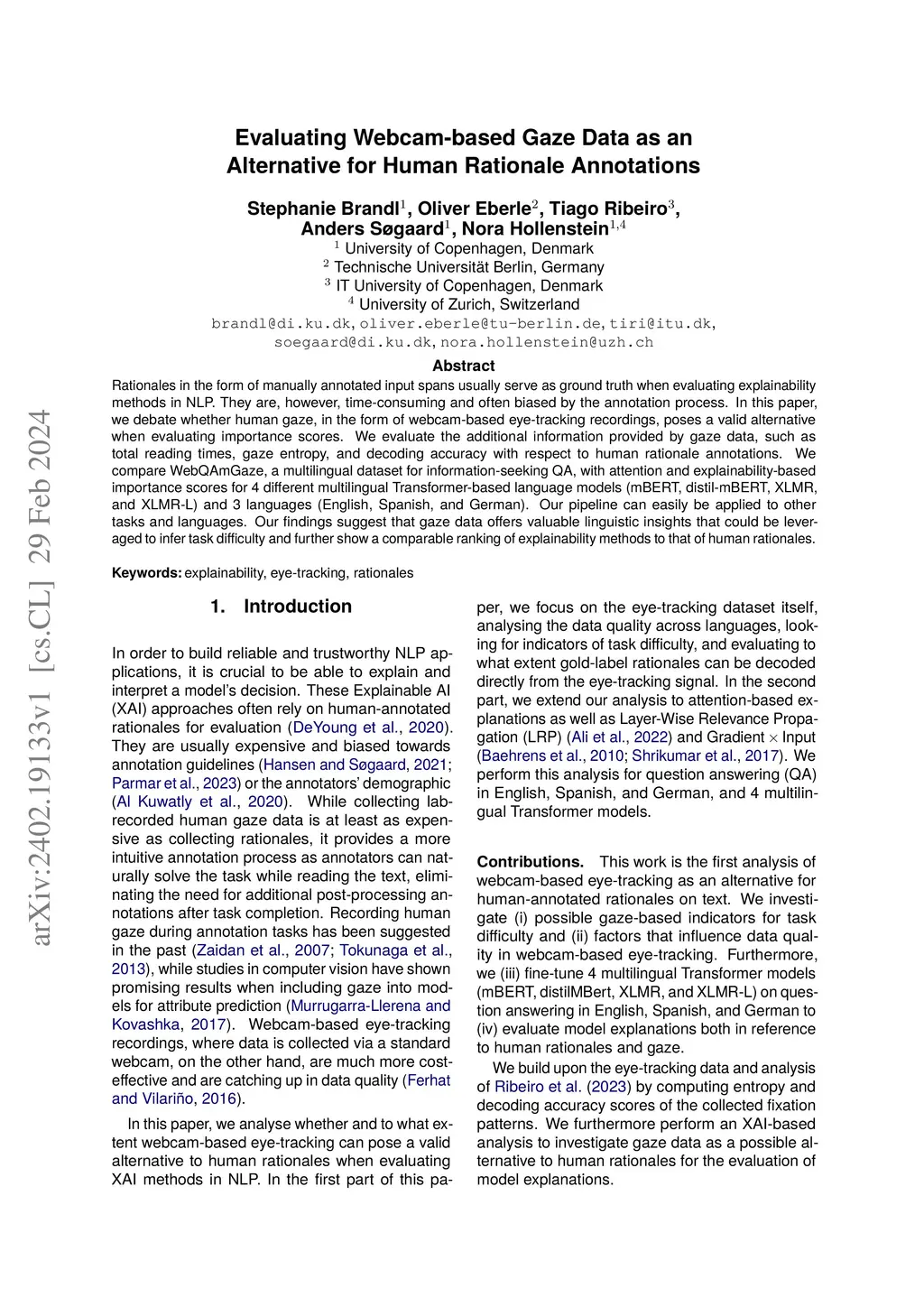 Rationales in the form of manually annotated input spans usually serve as ground truth when evaluating explainability methods in NLP. They are, however, time-consuming and often biased by the annotation process. In this paper, we debate whether human gaze, in the form of webcam-based eye-tracking recordings, poses a valid alternative when evaluating importance scores. We evaluate the additional information provided by gaze data, such as total reading times, gaze entropy, and decoding accuracy with respect to human rationale annotations. We compare WebQAmGaze, a multilingual dataset for information-seeking QA, with attention and explainability-based importance scores for 4 different multilingual Transformer-based language models (mBERT, distil-mBERT, XLMR, and XLMR-L) and 3 languages (English, Spanish, and German). Our pipeline can easily be applied to other tasks and languages. Our findings suggest that gaze data offers valuable linguistic insights that could be leveraged to infer task difficulty and further show a comparable ranking of explainability methods to that of human rationales.
