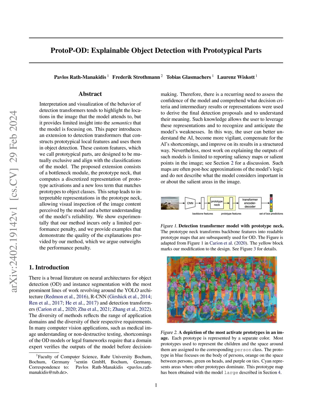Interpretation and visualization of the behavior of detection transformers tends to highlight the locations in the image that the model attends to, but it provides limited insight into the \emph{semantics} that the model is focusing on. This paper introduces an extension to detection transformers that constructs prototypical local features and uses them in object detection. These custom features, which we call prototypical parts, are designed to be mutually exclusive and align with the classifications of the model. The proposed extension consists of a bottleneck module, the prototype neck, that computes a discretized representation of prototype activations and a new loss term that matches prototypes to object classes. This setup leads to interpretable representations in the prototype neck, allowing visual inspection of the image content perceived by the model and a better understanding of the model's reliability. We show experimentally that our method incurs only a limited performance penalty, and we provide examples that demonstrate the quality of the explanations provided by our method, which we argue outweighs the performance penalty.