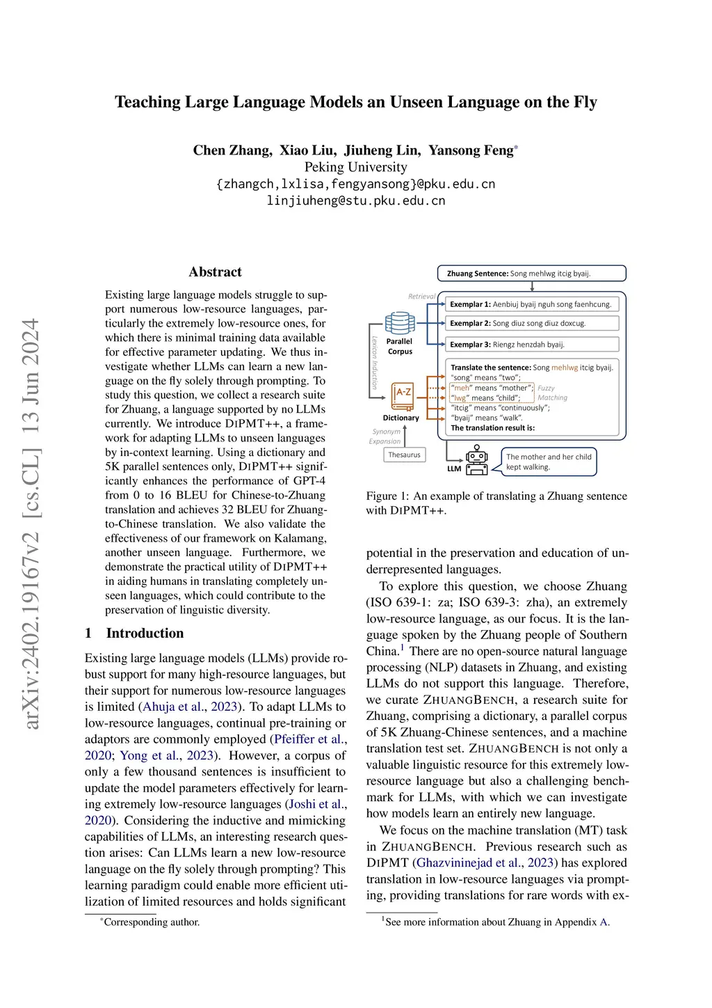 Existing large language models struggle to support numerous low-resource languages, particularly the extremely low-resource ones, for which there is minimal training data available for effective parameter updating. We thus investigate whether LLMs can learn a new language on the fly solely through prompting. To study this question, we collect a research suite for Zhuang, a language supported by no LLMs currently. We introduce DiPMT++, a framework for adapting LLMs to unseen languages by in-context learning. Using a dictionary and 5K parallel sentences only, DiPMT++ significantly enhances the performance of GPT-4 from 0 to 16 BLEU for Chinese-to-Zhuang translation and achieves 32 BLEU for Zhuang-to-Chinese translation. We also validate the effectiveness of our framework on Kalamang, another unseen language. Furthermore, we demonstrate the practical utility of DiPMT++ in aiding humans in translating completely unseen languages, which could contribute to the preservation of linguistic diversity.