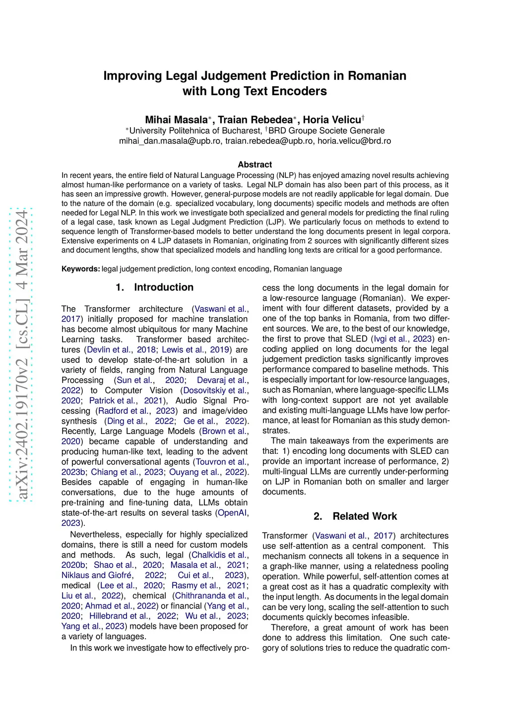 In recent years,the entire field of Natural Language Processing (NLP) has enjoyed amazing novel results achieving almost human-like performance on a variety of tasks. Legal NLP domain has also been part of this process, as it has seen an impressive growth. However, general-purpose models are not readily applicable for legal domain. Due to the nature of the domain (e.g. specialized vocabulary, long documents) specific models and methods are often needed for Legal NLP. In this work we investigate both specialized and general models for predicting the final ruling of a legal case, task known as Legal Judgment Prediction (LJP). We particularly focus on methods to extend to sequence length of Transformer-based models to better understand the long documents present in legal corpora. Extensive experiments on 4 LJP datasets in Romanian, originating from 2 sources with significantly different sizes and document lengths, show that specialized models and handling long texts are critical for a good performance.