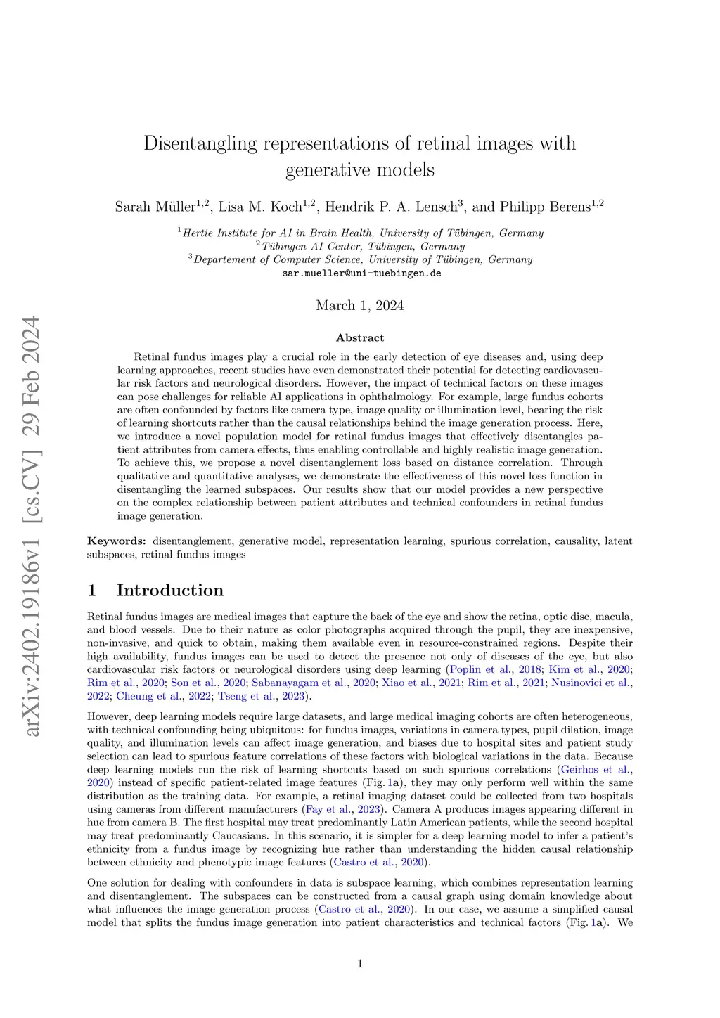 Retinal fundus images play a crucial role in the early detection of eye diseases. However, the impact of technical factors on these images can pose challenges for reliable AI applications in ophthalmology. For example, large fundus cohorts are often confounded by factors like camera type, bearing the risk of learning shortcuts rather than the causal relationships behind the image generation process. Here, we introduce a population model for retinal fundus images that effectively disentangles patient attributes from camera effects, enabling controllable and highly realistic image generation. To achieve this, we propose a disentanglement loss based on distance correlation. Through qualitative and quantitative analyses, we show that our models encode desired information in disentangled subspaces and enable controllable image generation based on the learned subspaces, demonstrating the effectiveness of our disentanglement loss. The project's code is publicly available:this https URL.