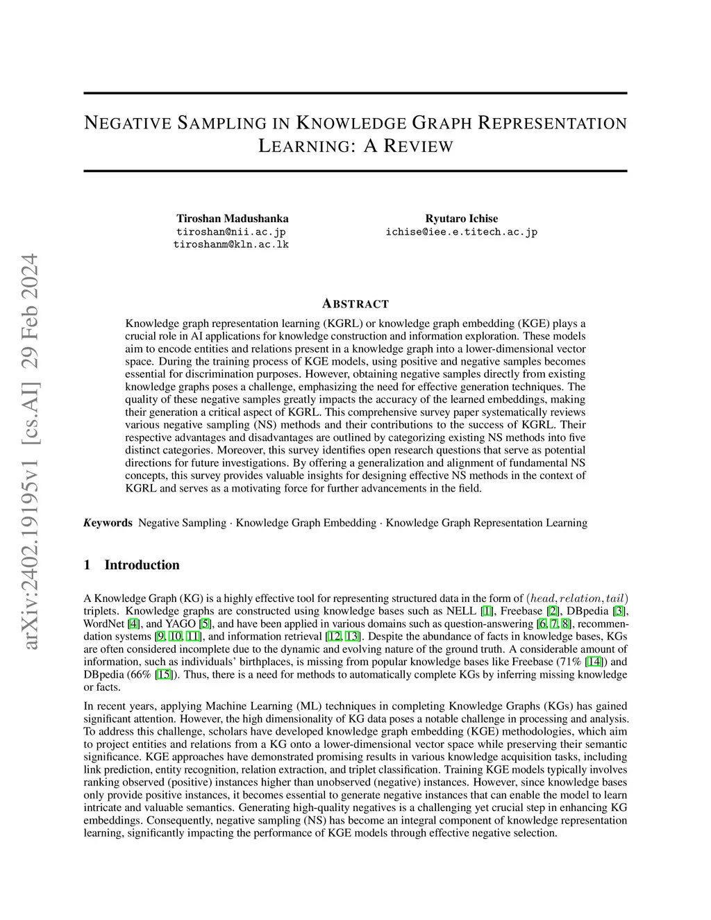 Negative Sampling in Knowledge Graph Representation Learning: A Review