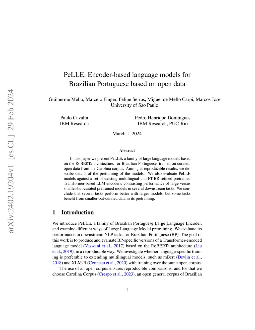 In this paper we present PeLLE, a family of large language models based on the RoBERTa architecture, for Brazilian Portuguese, trained on curated, open data from the Carolina corpus. Aiming at reproducible results, we describe details of the pretraining of the models. We also evaluate PeLLE models against a set of existing multilingual and PT-BR refined pretrained Transformer-based LLM encoders, contrasting performance of large versus smaller-but-curated pretrained models in several downstream tasks. We conclude that several tasks perform better with larger models, but some tasks benefit from smaller-but-curated data in its pretraining.