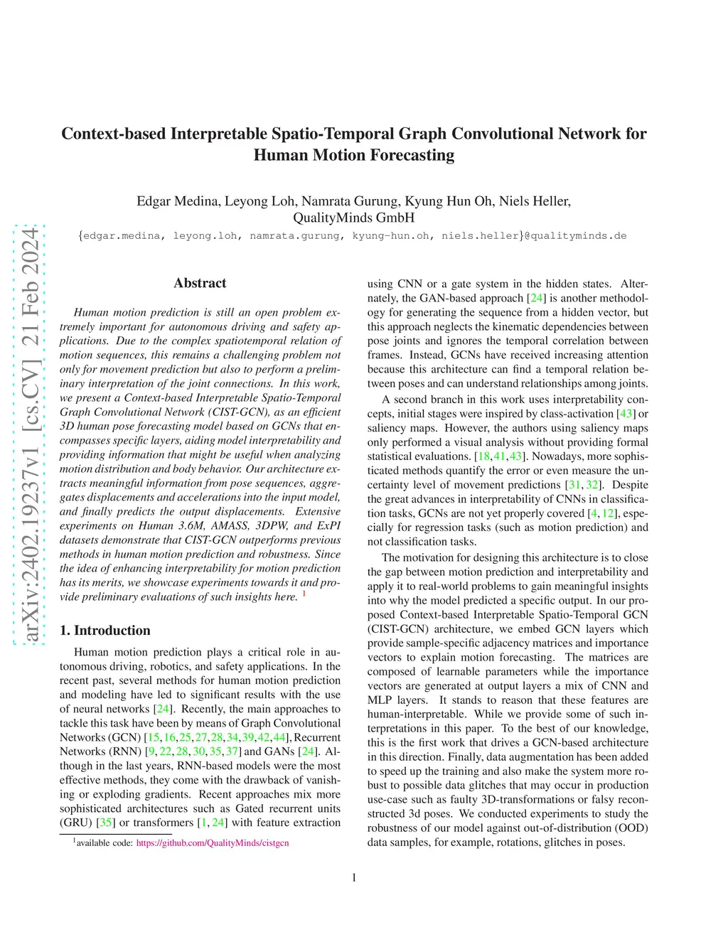 Human motion prediction is still an open problem extremely important for autonomous driving and safety applications. Due to the complex spatiotemporal relation of motion sequences, this remains a challenging problem not only for movement prediction but also to perform a preliminary interpretation of the joint connections. In this work, we present a Context-based Interpretable Spatio-Temporal Graph Convolutional Network (CIST-GCN), as an efficient 3D human pose forecasting model based on GCNs that encompasses specific layers, aiding model interpretability and providing information that might be useful when analyzing motion distribution and body behavior. Our architecture extracts meaningful information from pose sequences, aggregates displacements and accelerations into the input model, and finally predicts the output displacements. Extensive experiments on Human 3.6M, AMASS, 3DPW, and ExPI datasets demonstrate that CIST-GCN outperforms previous methods in human motion prediction and robustness. Since the idea of enhancing interpretability for motion prediction has its merits, we showcase experiments towards it and provide preliminary evaluations of such insights here. available code: https://github.com/QualityMinds/cistgcn