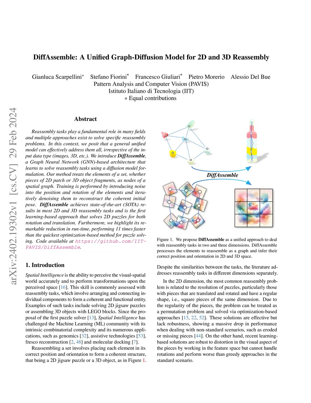 Reassembly tasks play a fundamental role in many fields and multiple approaches exist to solve specific reassembly problems. In this context, we posit that a general unified model can effectively address them all, irrespective of the input data type (images, 3D, etc.). We introduce DiffAssemble, a Graph Neural Network (GNN)-based architecture that learns to solve reassembly tasks using a diffusion model formulation. Our method treats the elements of a set, whether pieces of 2D patch or 3D object fragments, as nodes of a spatial graph. Training is performed by introducing noise into the position and rotation of the elements and iteratively denoising them to reconstruct the coherent initial pose. DiffAssemble achieves state-of-the-art (SOTA) results in most 2D and 3D reassembly tasks and is the first learning-based approach that solves 2D puzzles for both rotation and translation. Furthermore, we highlight its remarkable reduction in run-time, performing 11 times faster than the quickest optimization-based method for puzzle solving. Code available at https://github.com/IIT-PAVIS/DiffAssemble