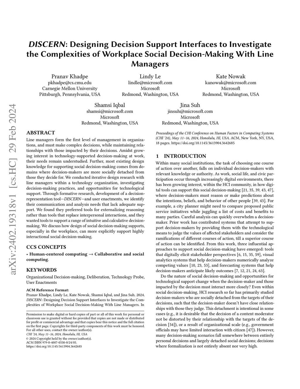 Line managers form the first level of management in organizations, and must make complex decisions, while maintaining relationships with those impacted by their decisions. Amidst growing interest in technology-supported decision-making at work, their needs remain understudied. Further, most existing design knowledge for supporting social decision-making comes from domains where decision-makers are more socially detached from those they decide for. We conducted iterative design research with line managers within a technology organization, investigating decision-making practices, and opportunities for technological support. Through formative research, development of a decision-representation tool -- DISCERN -- and user enactments, we identify their communication and analysis needs that lack adequate support. We found they preferred tools for externalizing reasoning rather than tools that replace interpersonal interactions, and they wanted tools to support a range of intuitive and calculative decision-making. We discuss how design of social decision-making supports, especially in the workplace, can more explicitly support highly interactional social decision-making.