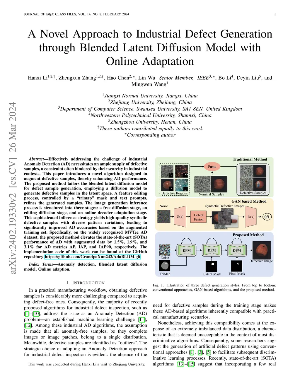 Effectively addressing the challenge of industrial Anomaly Detection (AD) necessitates an ample supply of defective samples, a constraint often hindered by their scarcity in industrial contexts. This paper introduces a novel algorithm designed to augment defective samples, thereby enhancing AD performance. The proposed method tailors the blended latent diffusion model for defect sample generation, employing a diffusion model to generate defective samples in the latent space. A feature editing process, controlled by a ``trimap" mask and text prompts, refines the generated samples. The image generation inference process is structured into three stages: a free diffusion stage, an editing diffusion stage, and an online decoder adaptation stage. This sophisticated inference strategy yields high-quality synthetic defective samples with diverse pattern variations, leading to significantly improved AD accuracies based on the augmented training set. Specifically, on the widely recognized MVTec AD dataset, the proposed method elevates the state-of-the-art (SOTA) performance of AD with augmented data by 1.5%, 1.9%, and 3.1% for AD metrics AP, IAP, and IAP90, respectively. The implementation code of this work can be found at the GitHub repository https://github.com/GrandpaXun242/AdaBLDM.git