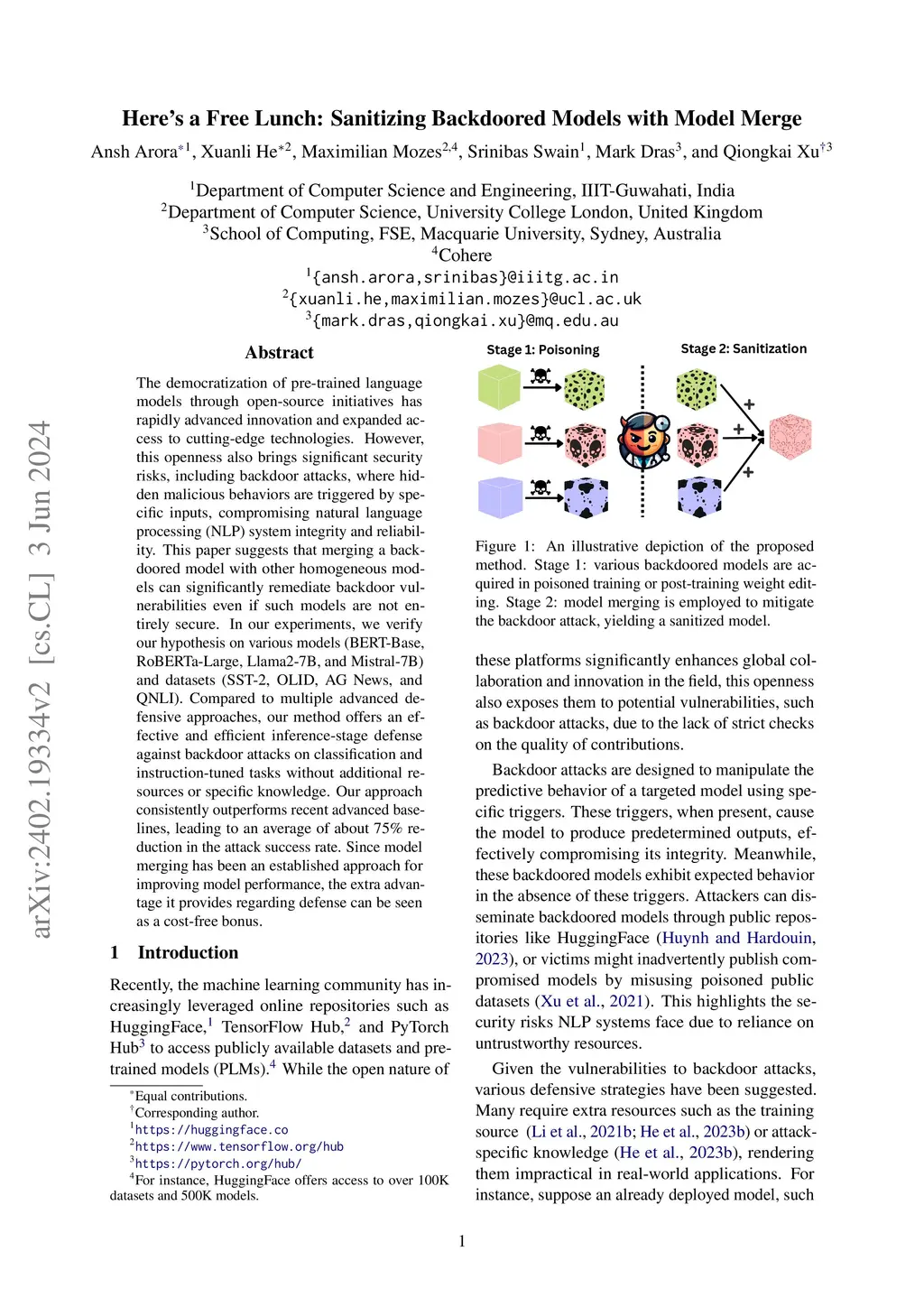 Here's a Free Lunch: Sanitizing Backdoored Models with Model Merge