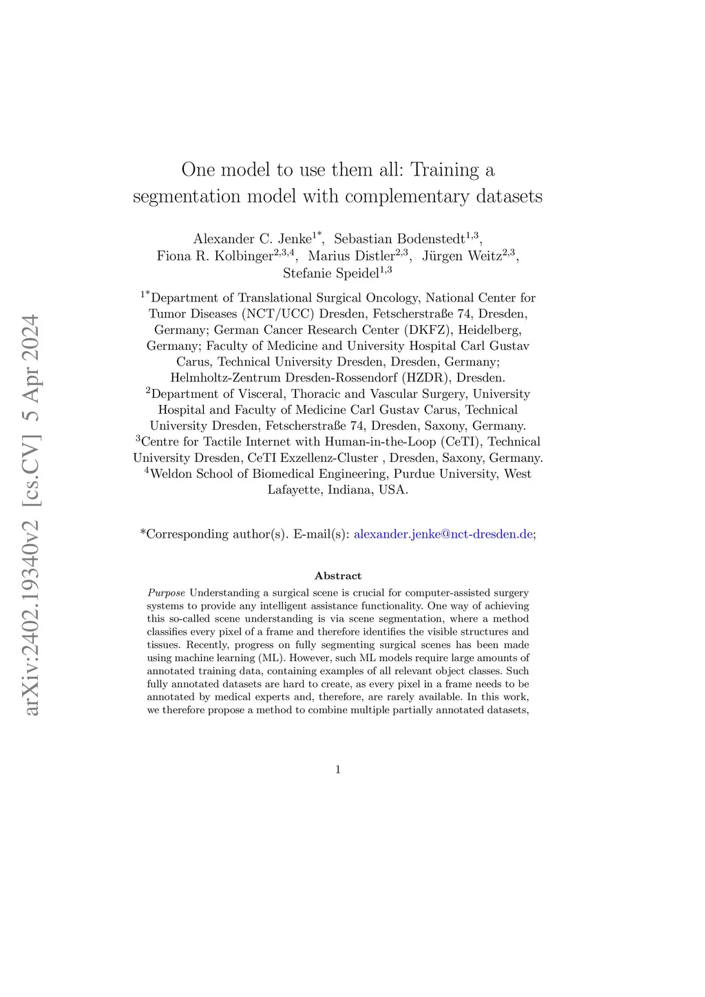 Understanding a surgical scene is crucial for computer-assisted surgery systems to provide any intelligent assistance functionality. One way of achieving this scene understanding is via scene segmentation, where every pixel of a frame is classified and therefore identifies the visible structures and tissues. Progress on fully segmenting surgical scenes has been made using machine learning. However, such models require large amounts of annotated training data, containing examples of all relevant object classes. Such fully annotated datasets are hard to create, as every pixel in a frame needs to be annotated by medical experts and, therefore, are rarely available. In this work, we propose a method to combine multiple partially annotated datasets, which provide complementary annotations, into one model, enabling better scene segmentation and the use of multiple readily available datasets. Our method aims to combine available data with complementary labels by leveraging mutual exclusive properties to maximize information. Specifically, we propose to use positive annotations of other classes as negative samples and to exclude background pixels of binary annotations, as we cannot tell if they contain a class not annotated but predicted by the model. We evaluate our method by training a DeepLabV3 on the publicly available Dresden Surgical Anatomy Dataset, which provides multiple subsets of binary segmented anatomical structures. Our approach successfully combines 6 classes into one model, increasing the overall Dice Score by 4.4% compared to an ensemble of models trained on the classes individually. By including information on multiple classes, we were able to reduce confusion between stomach and colon by 24%. Our results demonstrate the feasibility of training a model on multiple datasets. This paves the way for future work further alleviating the need for one large, fully segmented datasets.
