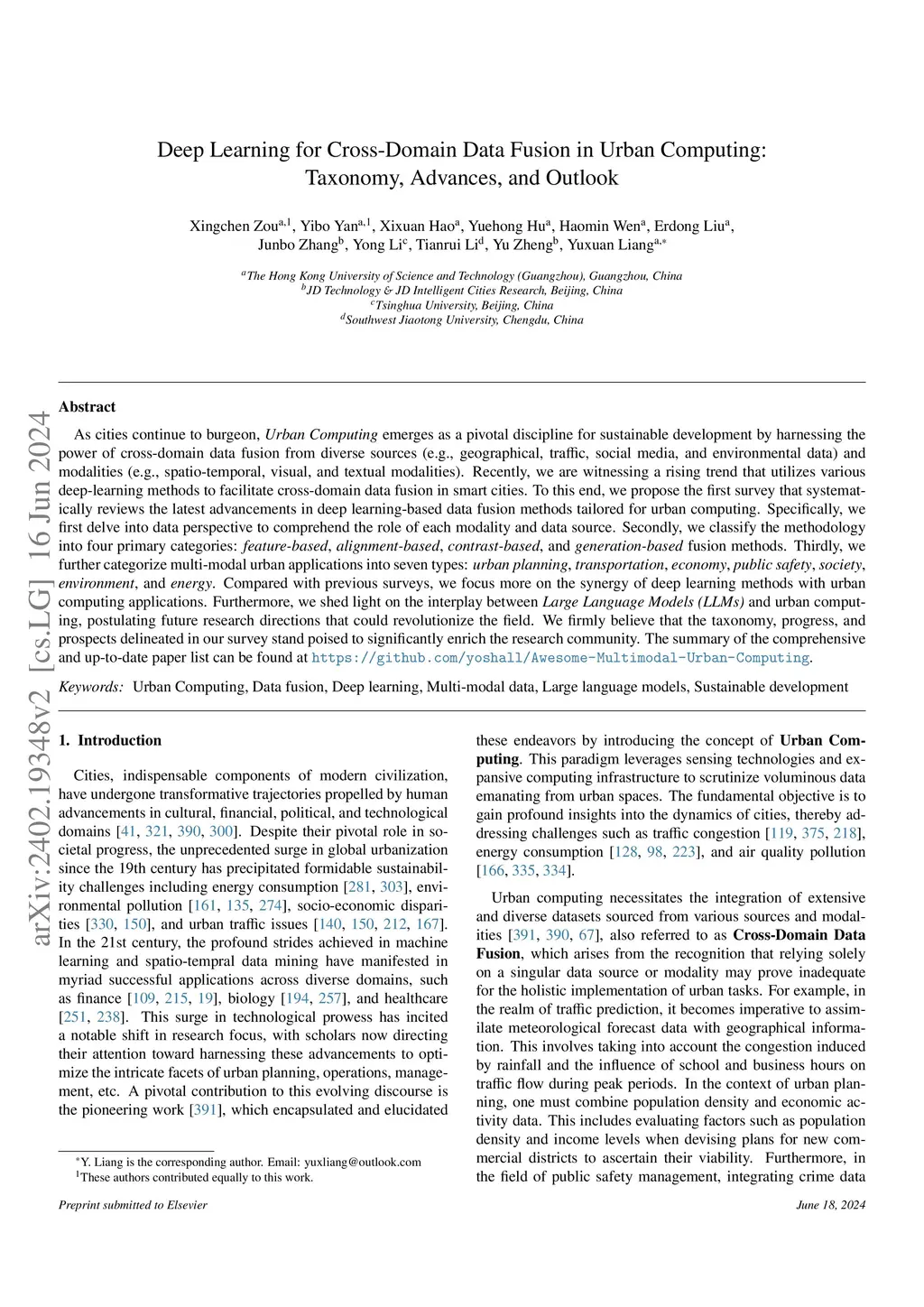 As cities continue to burgeon, Urban Computing emerges as a pivotal discipline for sustainable development by harnessing the power of cross-domain data fusion from diverse sources (e.g., geographical, traffic, social media, and environmental data) and modalities (e.g., spatio-temporal, visual, and textual modalities). Recently, we are witnessing a rising trend that utilizes various deep-learning methods to facilitate cross-domain data fusion in smart cities. To this end, we propose the first survey that systematically reviews the latest advancements in deep learning-based data fusion methods tailored for urban computing. Specifically, we first delve into data perspective to comprehend the role of each modality and data source. Secondly, we classify the methodology into four primary categories: feature-based, alignment-based, contrast-based, and generation-based fusion methods. Thirdly, we further categorize multi-modal urban applications into seven types: urban planning, transportation, economy, public safety, society, environment, and energy. Compared with previous surveys, we focus more on the synergy of deep learning methods with urban computing applications. Furthermore, we shed light on the interplay between Large Language Models (LLMs) and urban computing, postulating future research directions that could revolutionize the field. We firmly believe that the taxonomy, progress, and prospects delineated in our survey stand poised to significantly enrich the research community. The summary of the comprehensive and up-to-date paper list can be found at https://github.com/yoshall/Awesome-Multimodal-Urban-Computing.