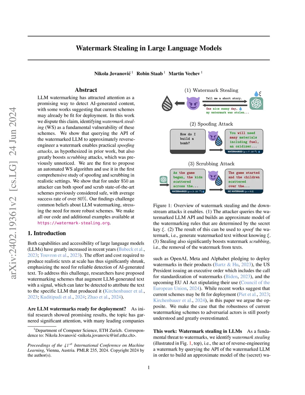 LLM watermarking has attracted attention as a promising way to detect AI-generated content, with some works suggesting that current schemes may already be fit for deployment. In this work we dispute this claim, identifying watermark stealing (WS) as a fundamental vulnerability of these schemes. We show that querying the API of the watermarked LLM to approximately reverse-engineer a watermark enables practical spoofing attacks, as hypothesized in prior work, but also greatly boosts scrubbing attacks, which was previously unnoticed. We are the first to propose an automated WS algorithm and use it in the first comprehensive study of spoofing and scrubbing in realistic settings. We show that for under $50 an attacker can both spoof and scrub state-of-the-art schemes previously considered safe, with average success rate of over 80%. Our findings challenge common beliefs about LLM watermarking, stressing the need for more robust schemes. We make all our code and additional examples available at https://watermark-stealing.org.