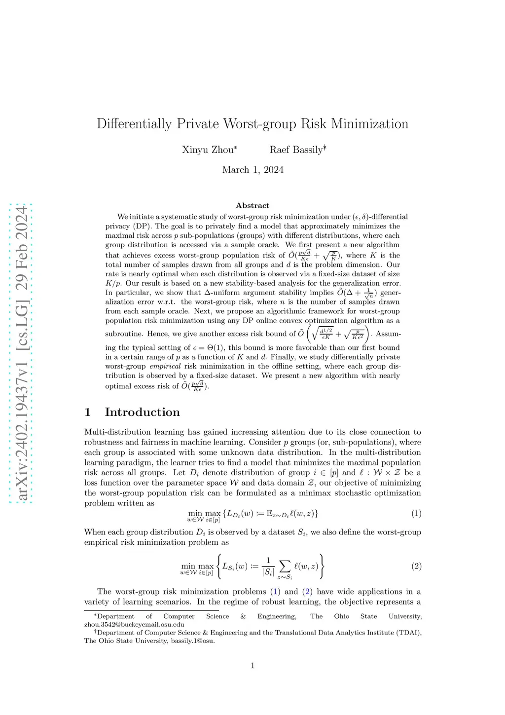 We initiate a systematic study of worst-group risk minimization under -differential privacy (DP). The goal is to privately find a model that approximately minimizes the maximal risk across sub-populations (groups) with different distributions, where each group distribution is accessed via a sample oracle. We first present a new algorithm that achieves excess worst-group population risk of , where is the total number of samples drawn from all groups and is the problem dimension. Our rate is nearly optimal when each distribution is observed via a fixed-size dataset of size . Our result is based on a new stability-based analysis for the generalization error. In particular, we show that -uniform argument stability implies generalization error w.r.t. the worst-group risk, where is the number of samples drawn from each sample oracle. Next, we propose an algorithmic framework for worst-group population risk minimization using any DP online convex optimization algorithm as a subroutine. Hence, we give another excess risk bound of . Assuming the typical setting of , this bound is more favorable than our first bound in a certain range of as a function of and . Finally, we study differentially private worst-group empirical risk minimization in the offline setting, where each group distribution is observed by a fixed-size dataset. We present a new algorithm with nearly optimal excess risk of .