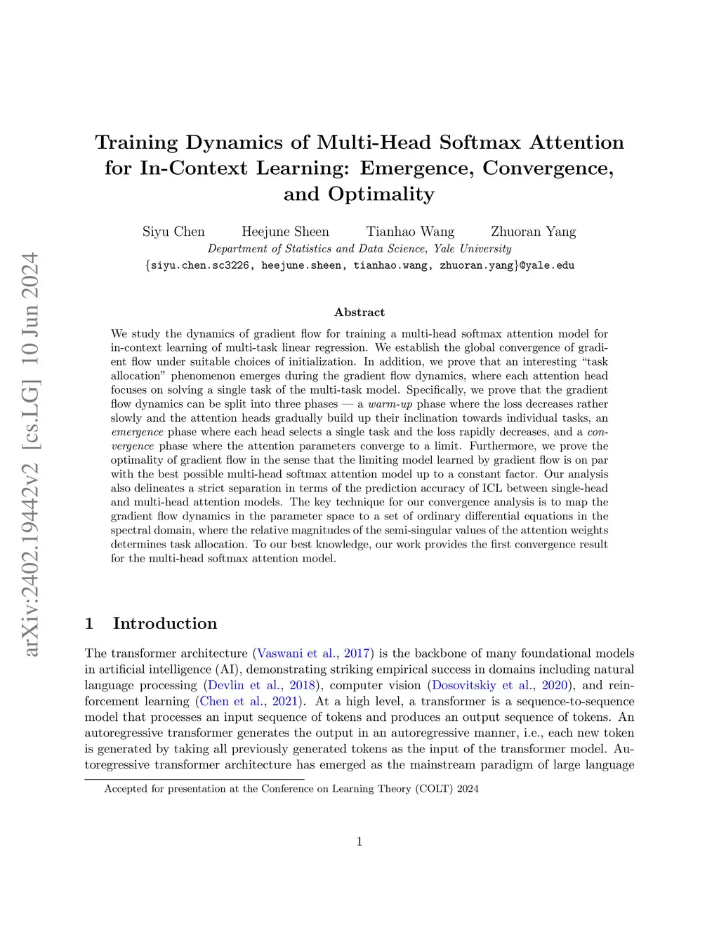 We study the dynamics of gradient flow for training a multi-head softmax attention model for in-context learning of multi-task linear regression. We establish the global convergence of gradient flow under suitable choices of initialization. In addition, we prove that an interesting "task allocation" phenomenon emerges during the gradient flow dynamics, where each attention head focuses on solving a single task of the multi-task model. Specifically, we prove that the gradient flow dynamics can be split into three phases -- a warm-up phase where the loss decreases rather slowly and the attention heads gradually build up their inclination towards individual tasks, an emergence phase where each head selects a single task and the loss rapidly decreases, and a convergence phase where the attention parameters converge to a limit. Furthermore, we prove the optimality of gradient flow in the sense that the limiting model learned by gradient flow is on par with the best possible multi-head softmax attention model up to a constant factor. Our analysis also delineates a strict separation in terms of the prediction accuracy of ICL between single-head and multi-head attention models. The key technique for our convergence analysis is to map the gradient flow dynamics in the parameter space to a set of ordinary differential equations in the spectral domain, where the relative magnitudes of the semi-singular values of the attention weights determines task allocation. To our best knowledge, our work provides the first convergence result for the multi-head softmax attention model.