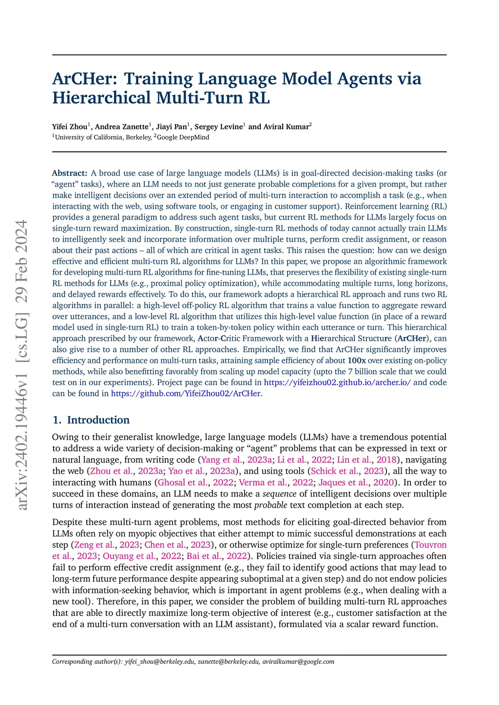 ArCHer: Training Language Model Agents via Hierarchical Multi-Turn RL
